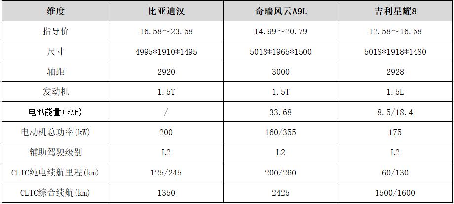 下面我们从几个维度来对比下这三款车的差异点(因A9L和星耀8都是混动产品,因此选取汉混动版本来对比),可以看出比亚迪在价格、尺寸、综合续航方面都要弱于竞品。