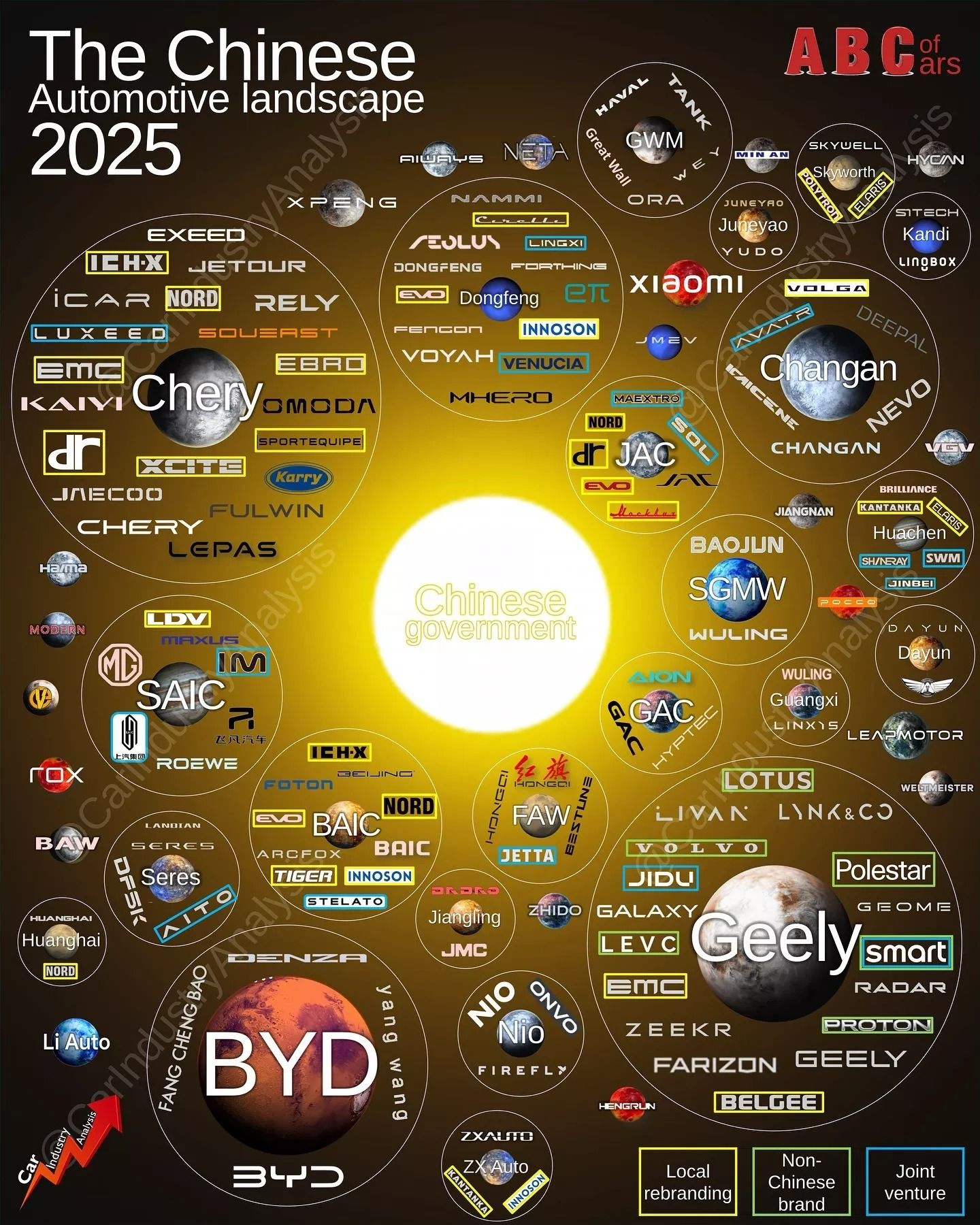中国汽车市场的品牌数量庞大、结构复杂,外界经常难以厘清谁属于谁。 一份由汽车行业分析师Felipe Munoz所绘制的图表,近期在业界掀起讨论热潮。 这张图表揭露了目前所有由中国企业完全或部分拥有的汽车品牌,从巨头集团、国营企业到新创势力,呈现出中国汽车产业的完整权力地图。