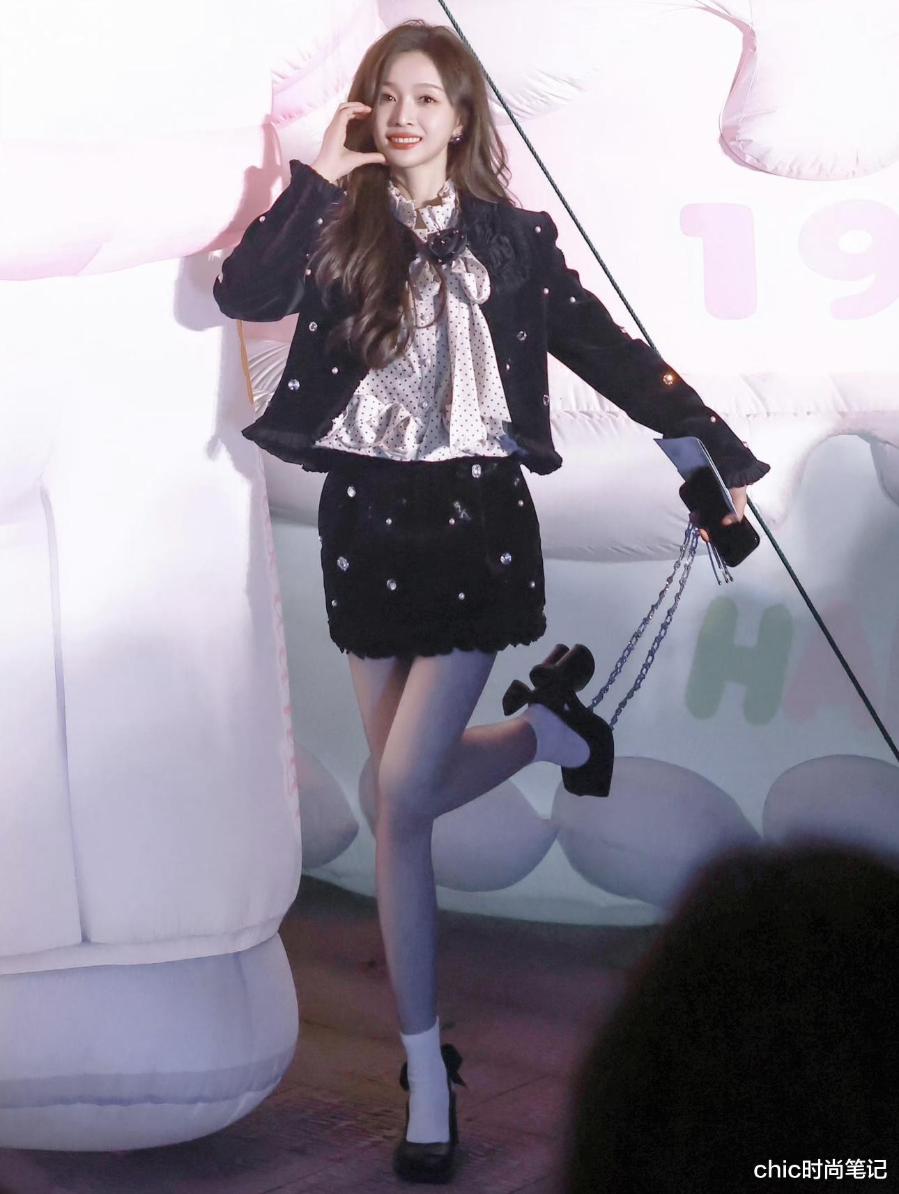 裸粉色波点衬衫上的山茶花系带立体而精致,搭配黑丝绒小香风外套和短裙,小香风套装裙上的宝石点缀自带闪光感。