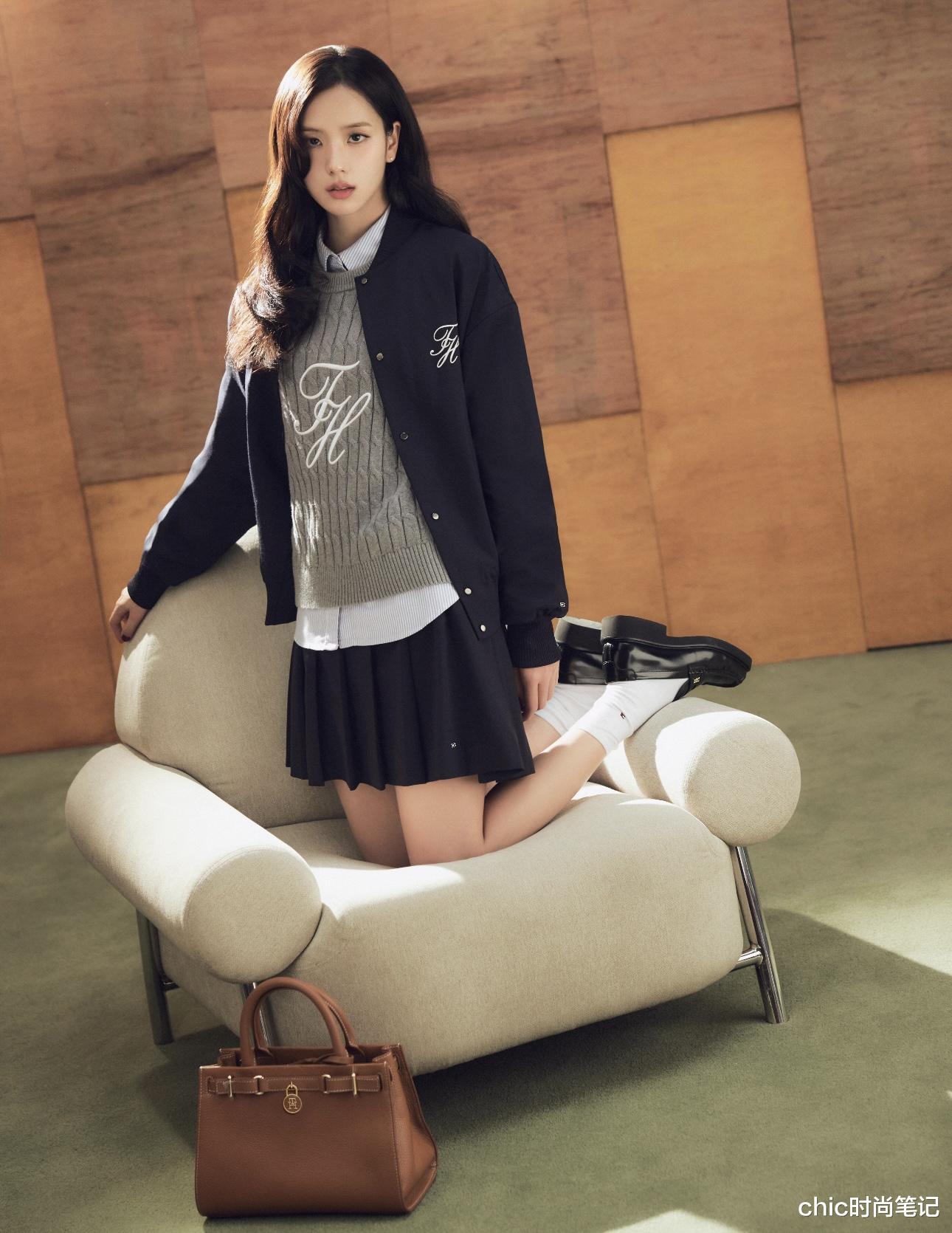 韩娱顶级爱豆组合black pink成员金智秀精致的五官下是可爱少女的内在。白色衬衫+灰色毛衣马甲+棒球服外套+百褶短裙,非常经典的一套学院风穿搭,减龄的同时又不失时尚魅力。