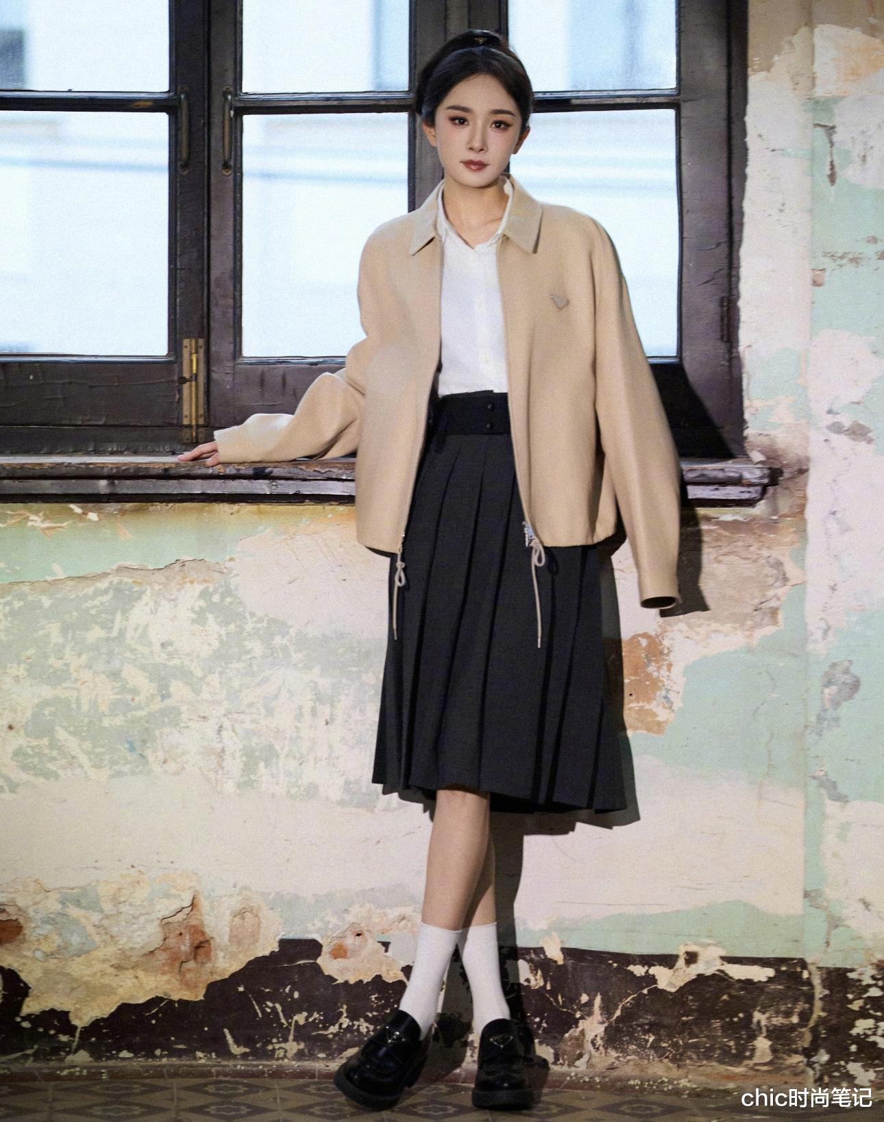恭喜杨幂成为Prada无考察期代言人,其实杨幂与Prada的调性还是比较搭的,一件卡其色质感外套内搭白色衬衫+黑色百褶裙,整套穿搭都显得十分俏皮与活泼,小白袜和小皮鞋的加持,满满的校园气息。