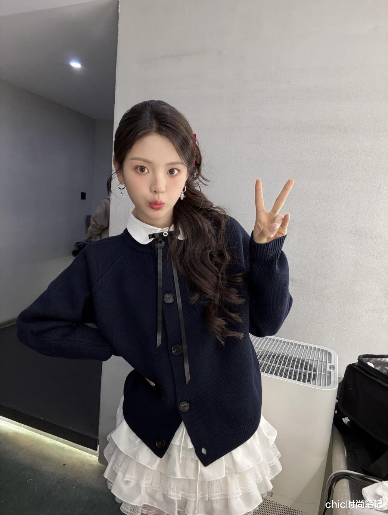 杨超越的完美建模脸穿什么都很洋气!白色圆领衬衫搭配黑色丝带蝴蝶结,外搭一件黑色针织毛衣外套,下身选择的是白色蛋糕裙,活力且美丽。