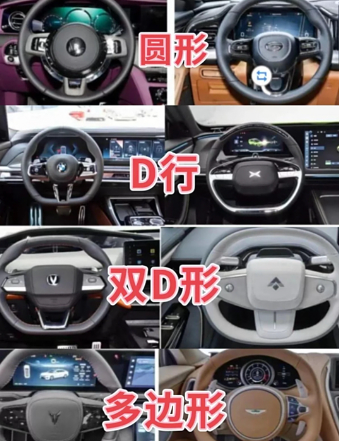 方向盘的分类可以从两个角度,一个是方向盘的形状,一个是方向盘有几辐,那我么就分别来讲一讲。 从方向盘的形状来分的话,主要分类圆形方向盘/ D形方向盘/双D形方向盘/多边形方向盘。 圆形方向盘:最为经典,使用频率最高。 D形方向盘:方便驾驶员进出车辆时不蹭到方向盘。 双D形方向盘:方便看仪表盘,开扬性强。 多边形方向盘:使用频率低,赛车上使用的更频繁一些。 从方向盘的副数来分类的话,主要有半辐方向盘/两辐方向盘/三辐方向盘/四辐方向盘。 半辐方向盘:直接将方向盘的最上部削掉,以追求最大视野。 两辐方向盘:使用频率低,设计出来显得比较笨重,不好看。 三辐方向盘:也就是T字型方向盘,实际意义不大,主要做陪衬,第三幅主要以设计为主,整体更加的偏向动感。 四辐方向盘:跟三幅式一样,主要做装饰作用,用的频率也不高,因为比较笨重比较大,所以一般都用在中大型车上。