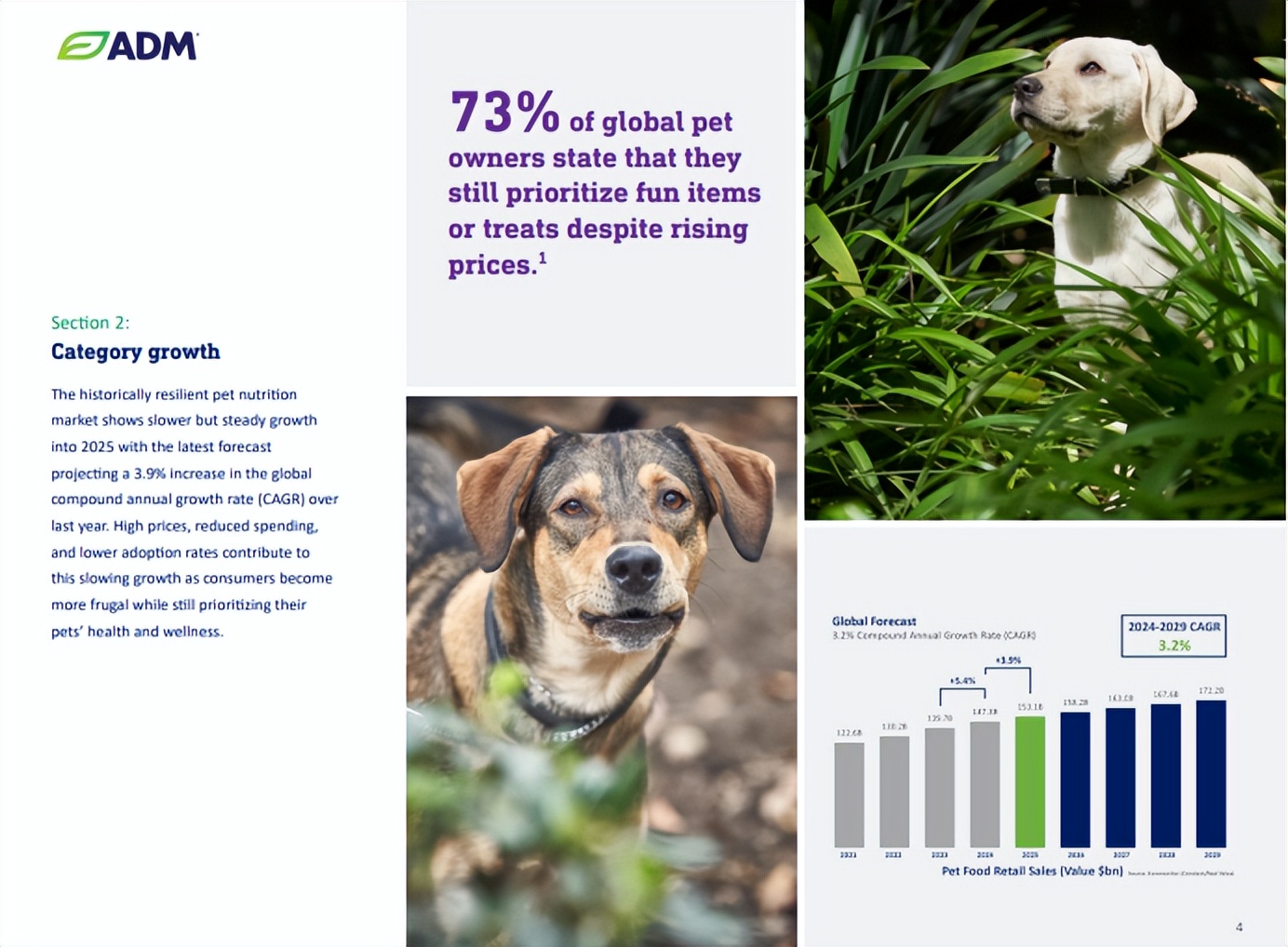 宠物营养市场保持增长势头根据ADM的报告,到2025年,宠物营养市场增长速度将有所放缓,但依然保持稳定。最新预测显示,全球复合年增长率(CAGR)将较去年增长3.9%。由于消费者在注重宠物健康和福祉的同时,更加注重节俭,高昂的价格、支出的减少以及较低的领养率,导致宠物营养市场增长放缓。