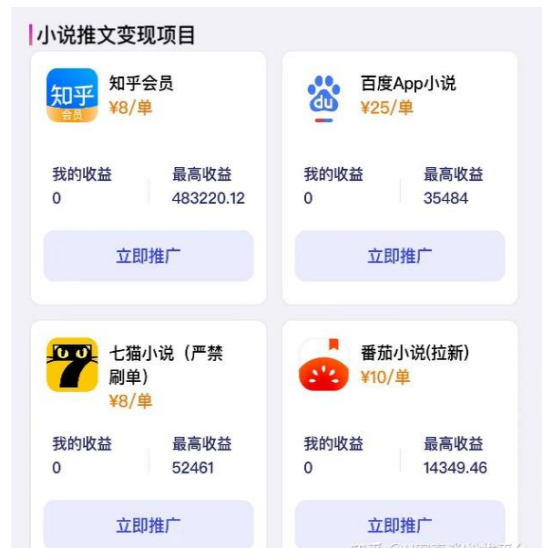 目前收益最高的小说推文项目有。