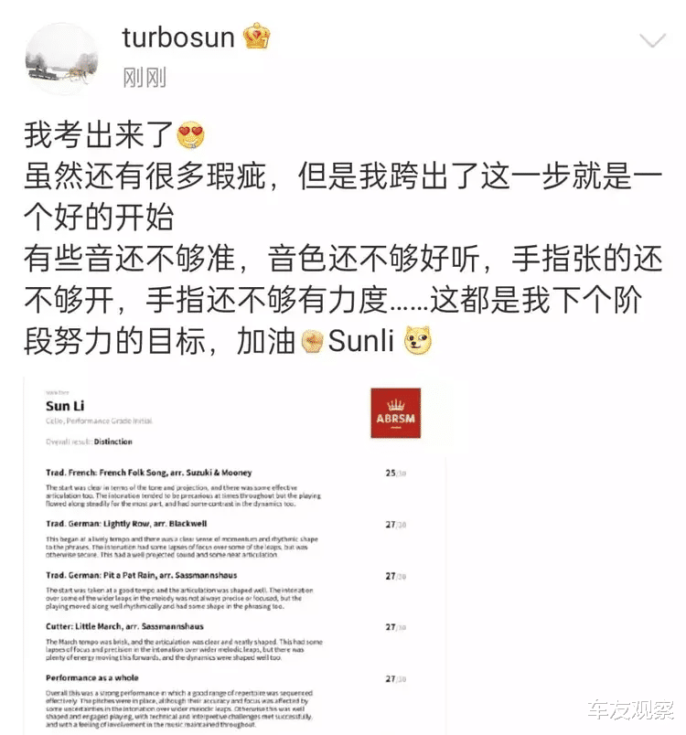 而孙俪也总结了自己的不足,说“有些音还不够准,音色还不够好听,手指张的还不够开,手指还不够有力度……这都是我下个阶段努力的目标,加油Sunli ”
