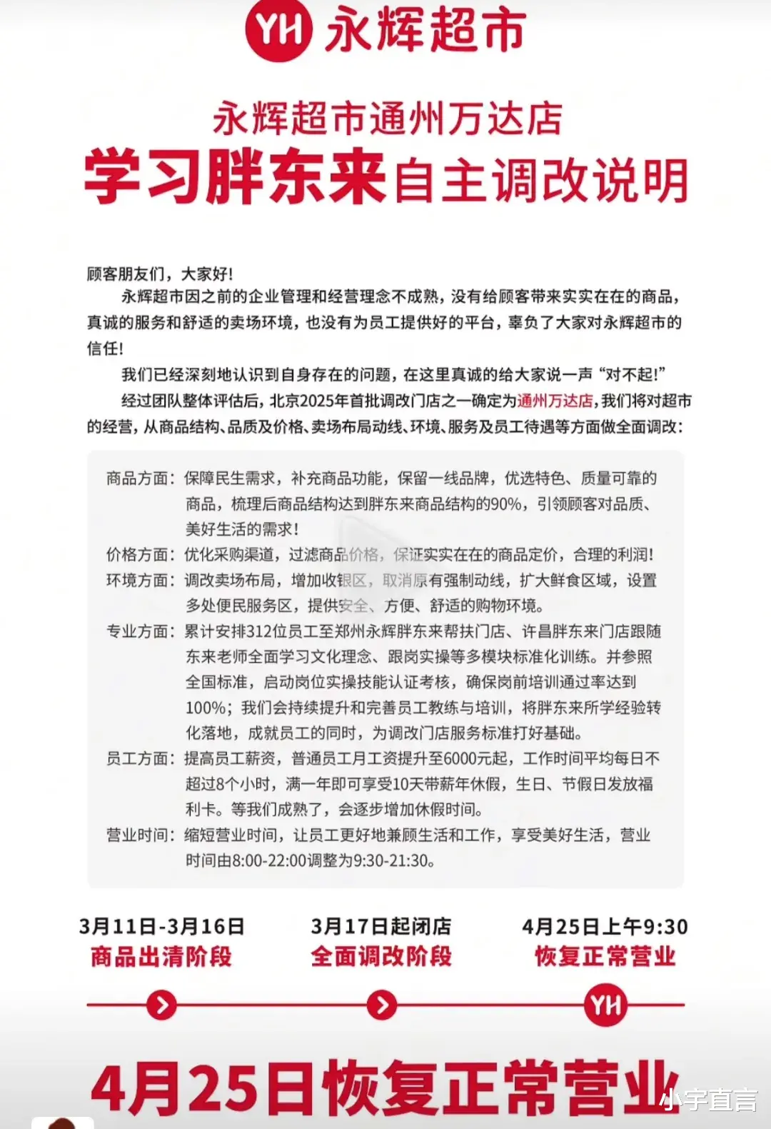 据了解,永辉通州万达店为永辉北京2025年首批调改门店之一,永辉超市将从商品结构、品质及价格、环境、服务等多方面进行调改,预计4月25日恢复正常营业。