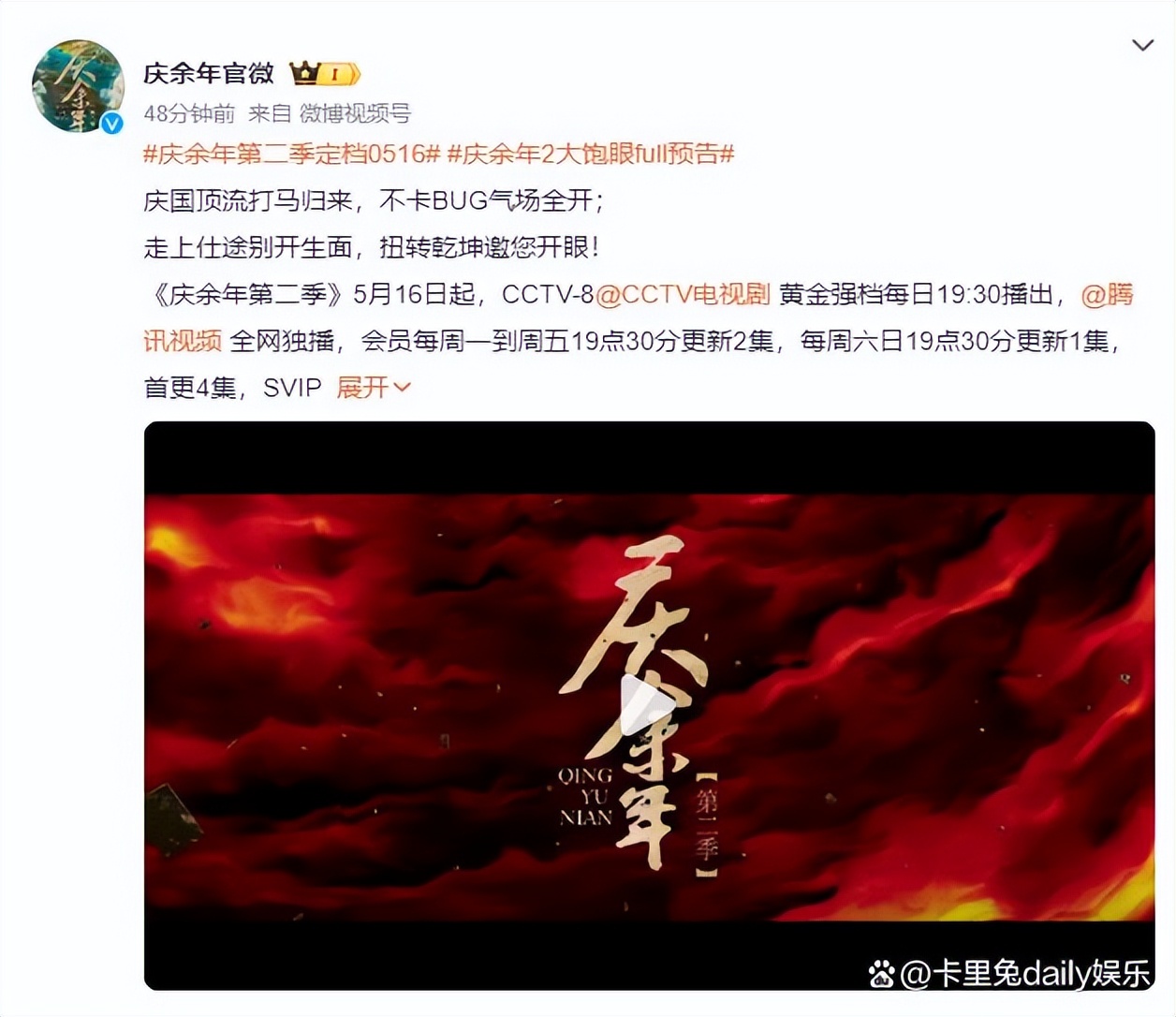 在万千剧迷的翘首期盼中,由张若昀、李沁等实力派演员联袂主演的古装巨制《庆余年2》终于在近日掷下重磅炸弹——官方预告片震撼发布,并正式宣布定档于5月16日,同时登陆CCTV-8与腾讯视频两大平台,为全国观众奉上一场视听盛宴。这一喜讯犹如春风拂面,瞬间点燃了粉丝们的热情,也给剧荒的观众带来了新的期待。