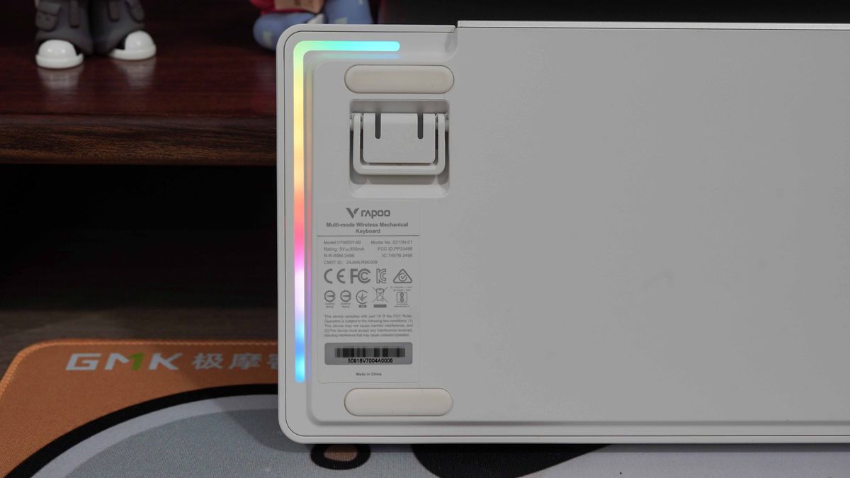 两段式硅胶脚撑,支持三种使用高度。村民的手是属于小手类型,通常使用小脚撑的高度最为舒服,但很对键盘往往只有一段脚撑,撑起来了太高,放下来又太低了。雷柏V700DIY-98刚好是考虑到我这情况。