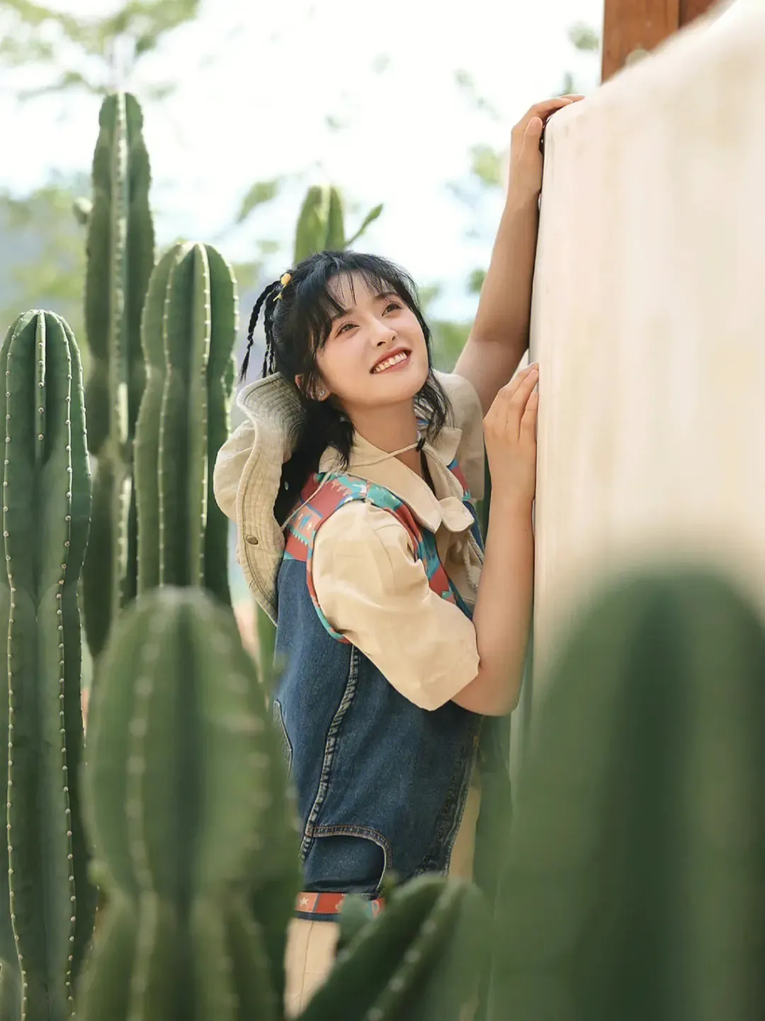 “背带裤”本身就是一种减龄的单品,选择一条纯色的百搭背带裤,简约百搭,尤其牛仔背带裤,会更加学院感,像沈月一样搭配白色上衣或者娃娃领碎花上衣,减龄又可爱~