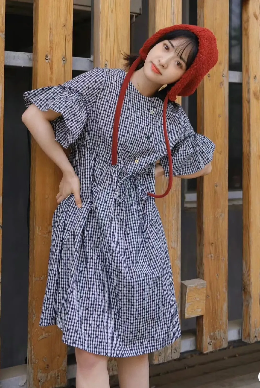 不难发现,沈月的大部分穿搭都运用了彩色,或者有娃娃领、荷叶边等减龄甜美的设计单品,像图一的蓝色格纹裙,非常的清新书信感,而图三的荷叶边格纹非常文艺,加上红色帽子,整个穿搭就有了亮点,但仔细观察发现这些裙子都是;有腰线设计的,包括粉丝连衣裙也用了腰带去营造腰线,既拉高了身材比例,也能达到理想的效果~