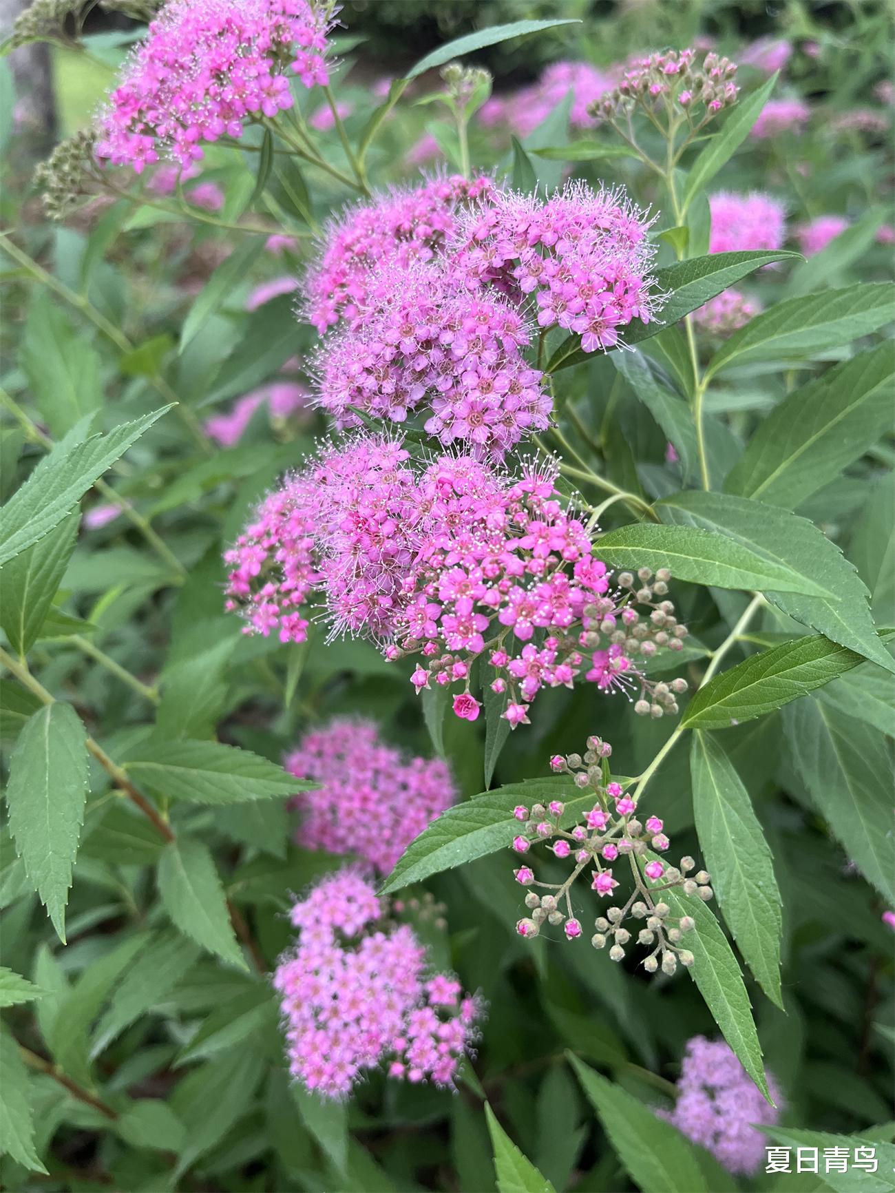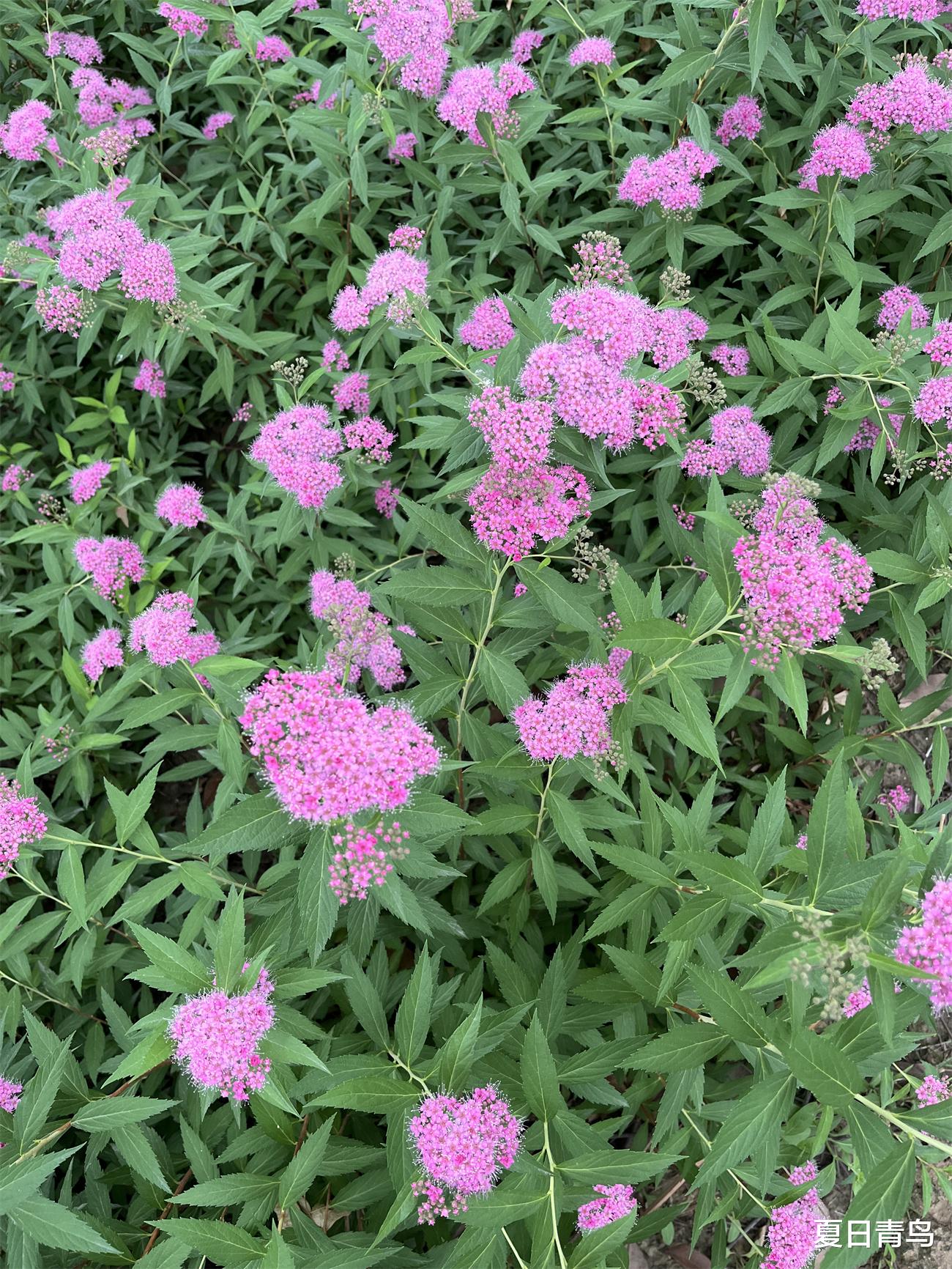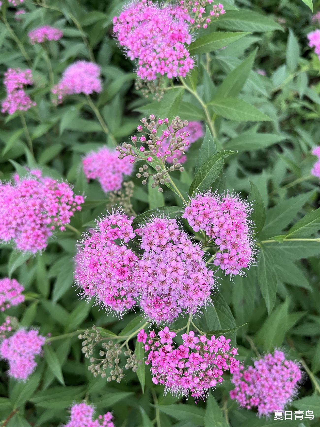 粉花绣线菊(Spiraea japonica L. f.)是蔷薇科绣线菊属的直立灌木,高可达1.5米。枝条细长,近圆柱形;冬芽卵形,有数个鳞片;叶片卵形至卵状椭圆形,先端急尖至短渐尖,叶柄具短柔毛;复伞房花序生于当年生的直立新枝顶端,苞片披针形至线状披针形,花萼外面有稀疏短柔毛,萼筒钟状,萼片三角形,粉红色花瓣卵形至圆形,花盘圆环形;花期6~7月;果期8~9月。