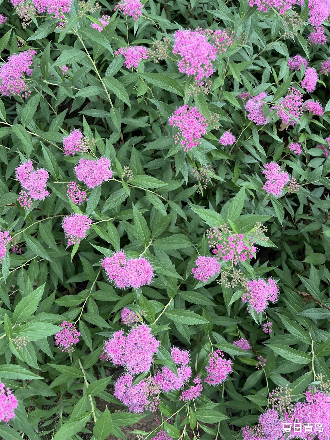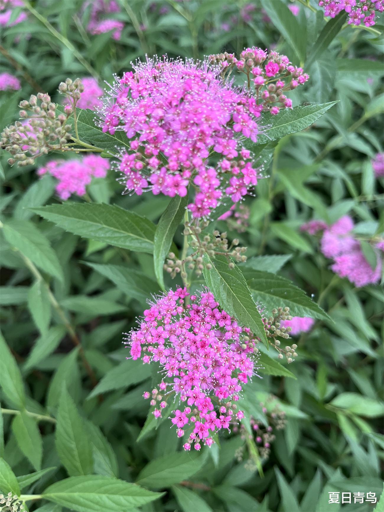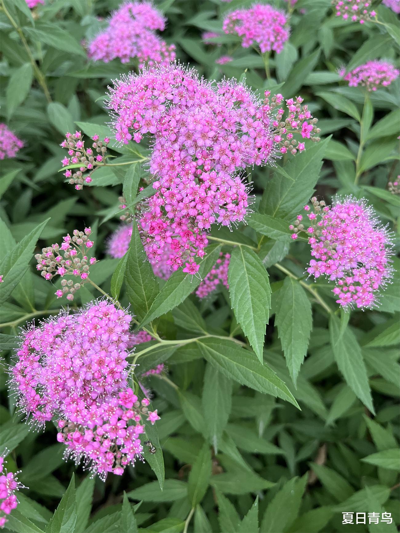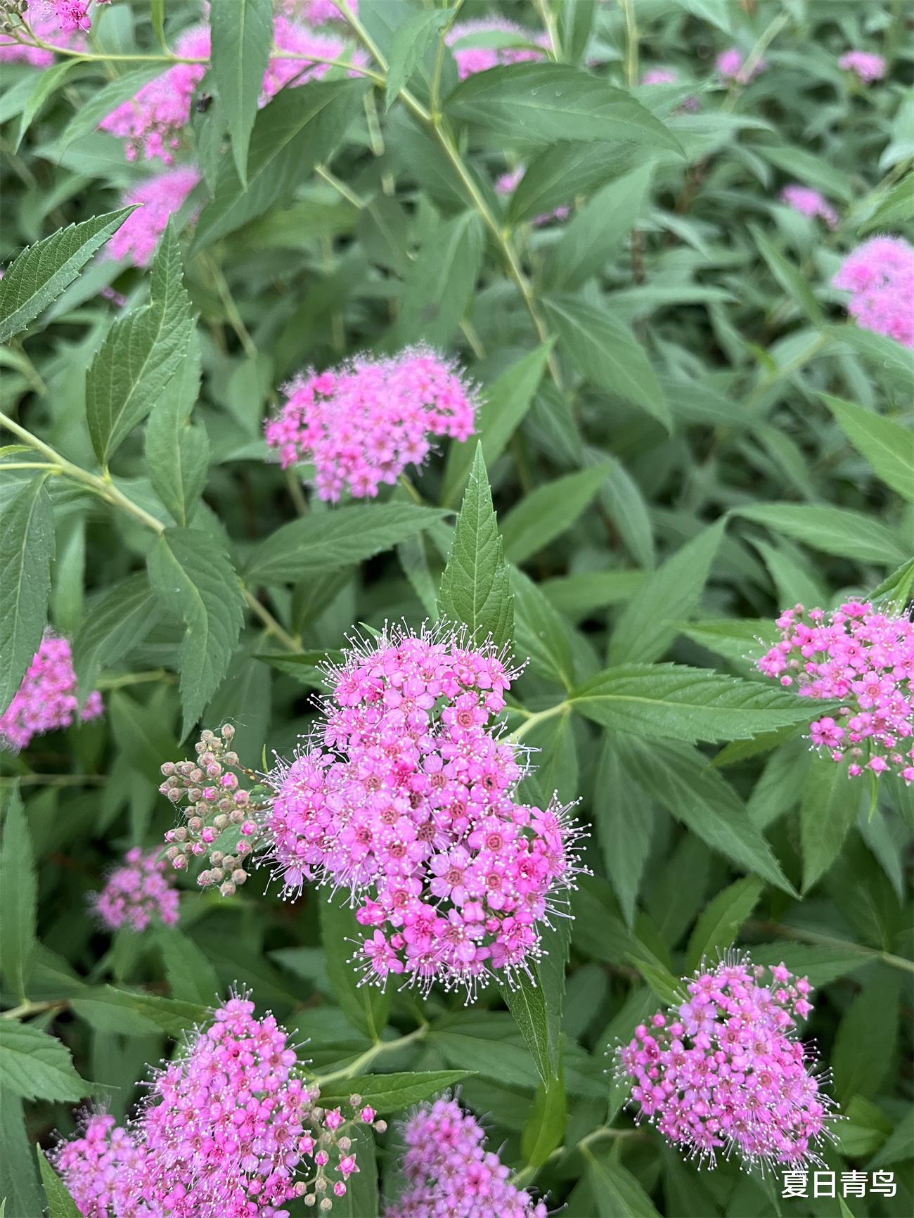 粉花绣线菊(Spiraea japonica L. f.)是蔷薇科绣线菊属的直立灌木,高可达1.5米。枝条细长,近圆柱形;冬芽卵形,有数个鳞片;叶片卵形至卵状椭圆形,先端急尖至短渐尖,叶柄具短柔毛;复伞房花序生于当年生的直立新枝顶端,苞片披针形至线状披针形,花萼外面有稀疏短柔毛,萼筒钟状,萼片三角形,粉红色花瓣卵形至圆形,花盘圆环形;花期6~7月;果期8~9月。
