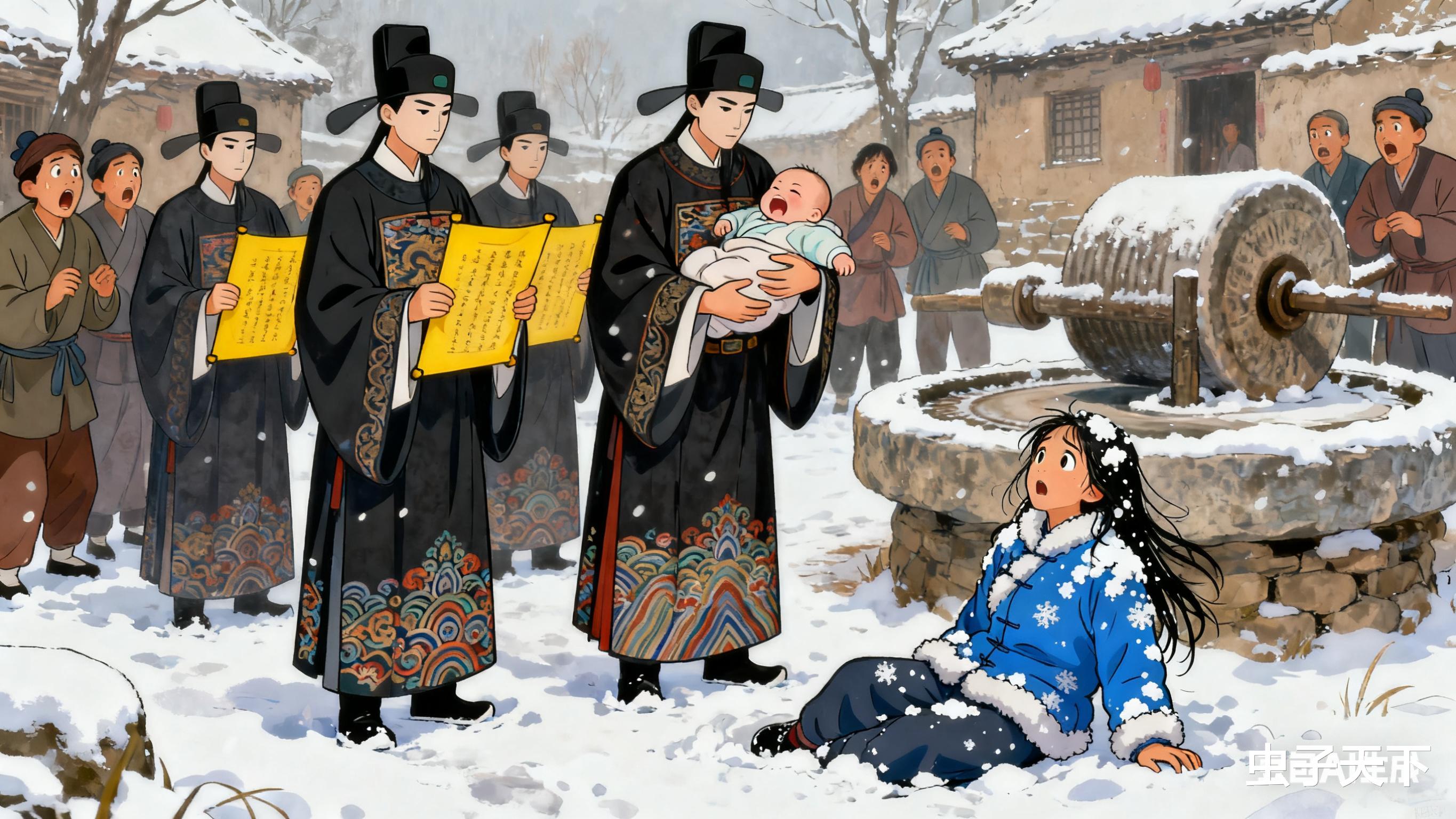 次日五更,春娘抱着"皇子"回村时,雪正下得紧。