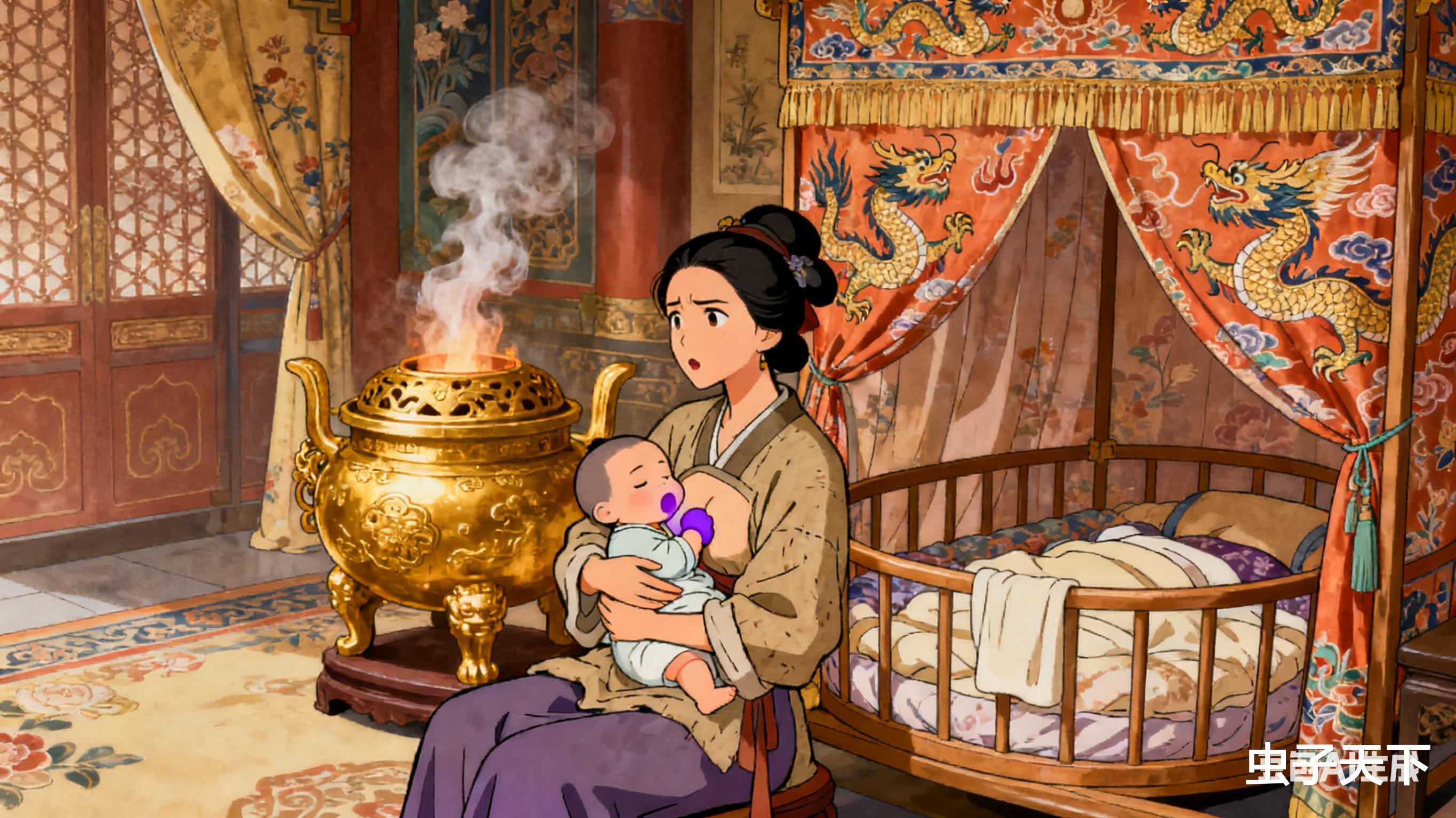 她慌忙把睡熟的皇子放回摇篮,刚转身却听见身后"咚"的闷响。