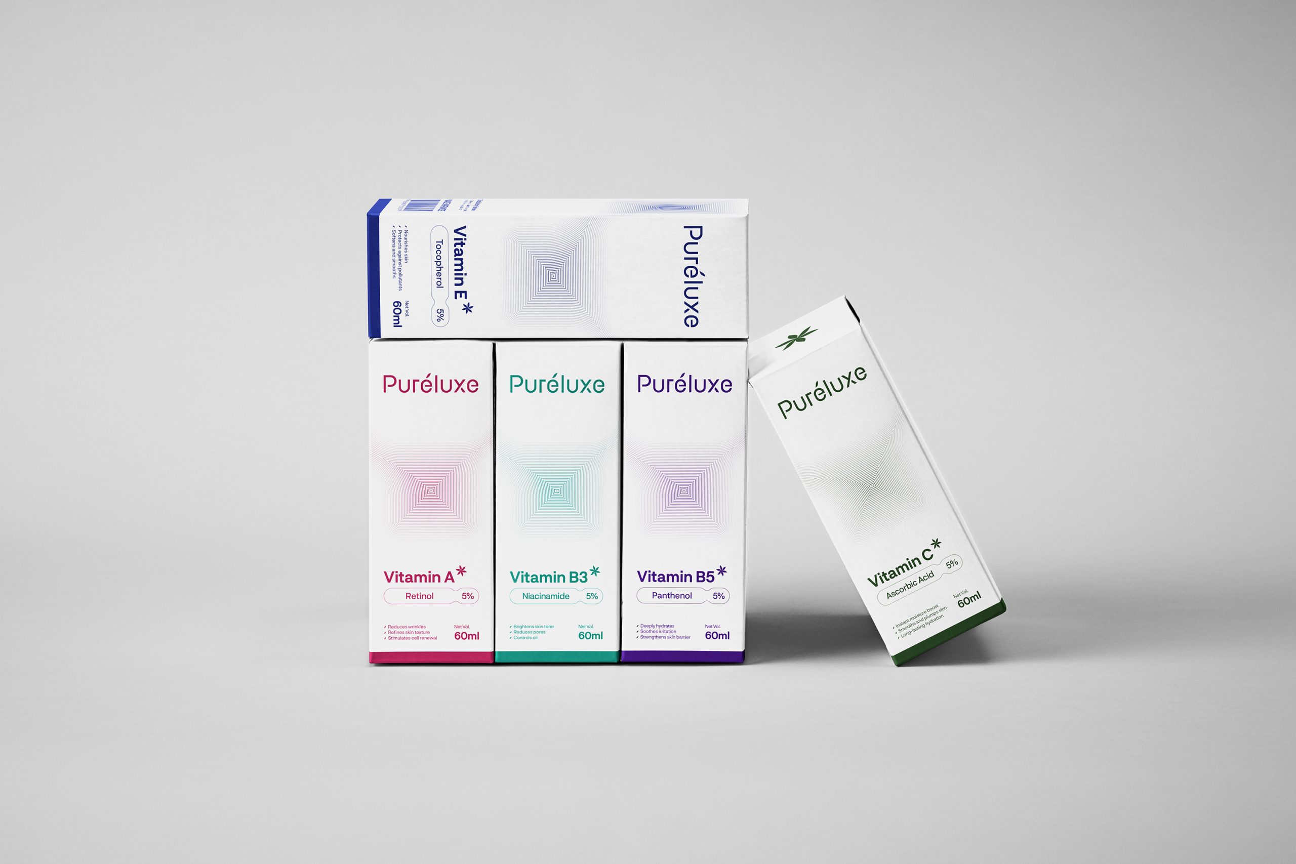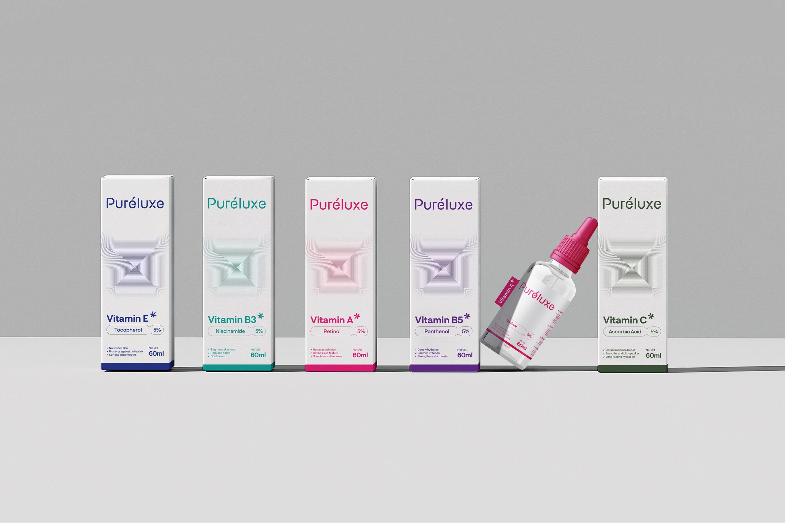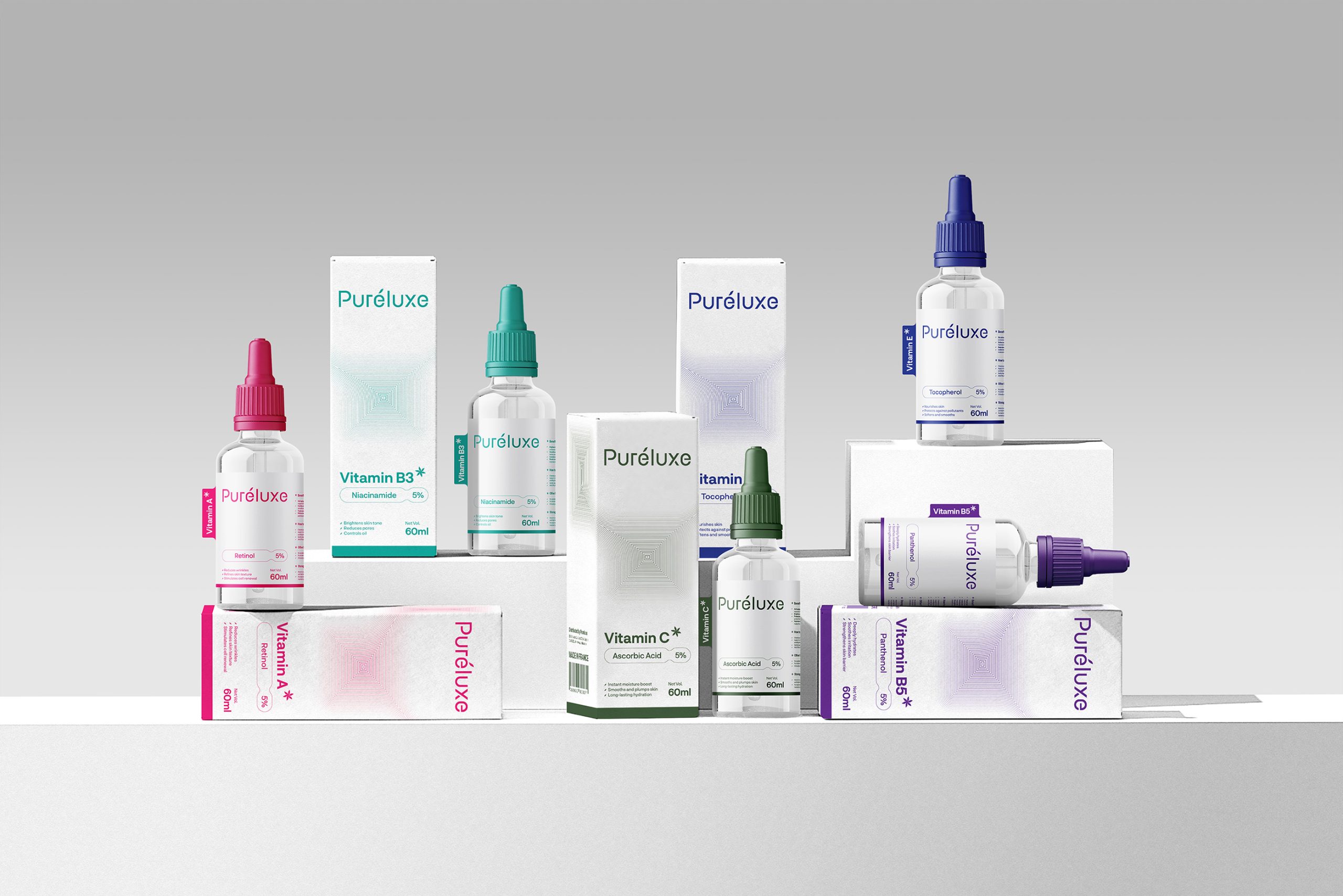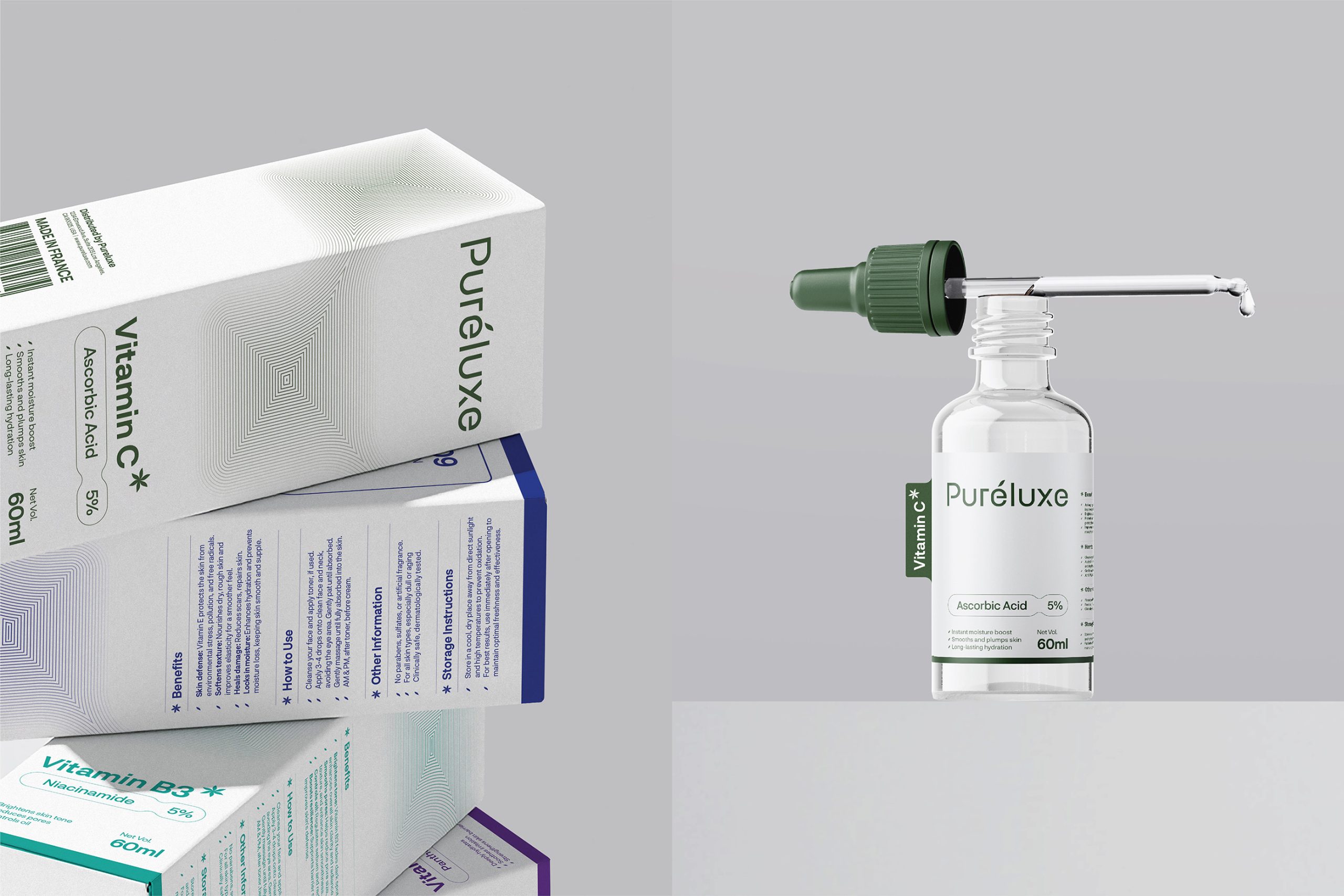 Pureluxe的包装设计则像是一场色彩与几何的时尚狂欢。白色的瓶身与包装盒是它的时尚底色,简洁而干净。品牌名称与产品信息以鲜明的色彩呈现,维生素种类对应的彩色滴头和文字标识,就像时尚秀场上的亮眼配饰,瞬间抓住眼球。包装盒上的几何线条纹理,如同精心编织的时尚密码,增添了设计的层次感与现代感。整体设计既展现了产品的专业与可靠,又不失时尚活力,仿佛在向消费者宣告:护肤也可以如此时尚有趣。