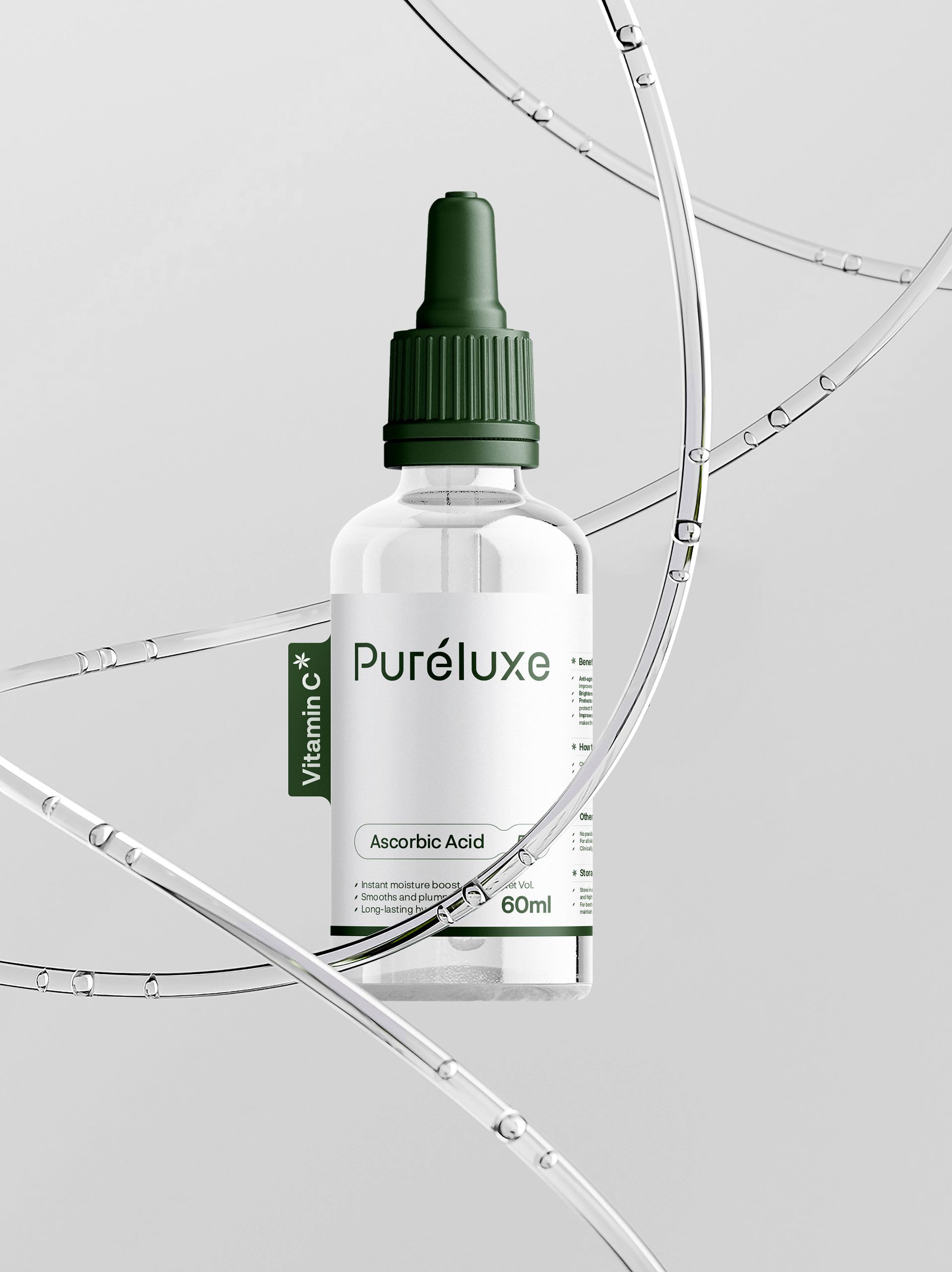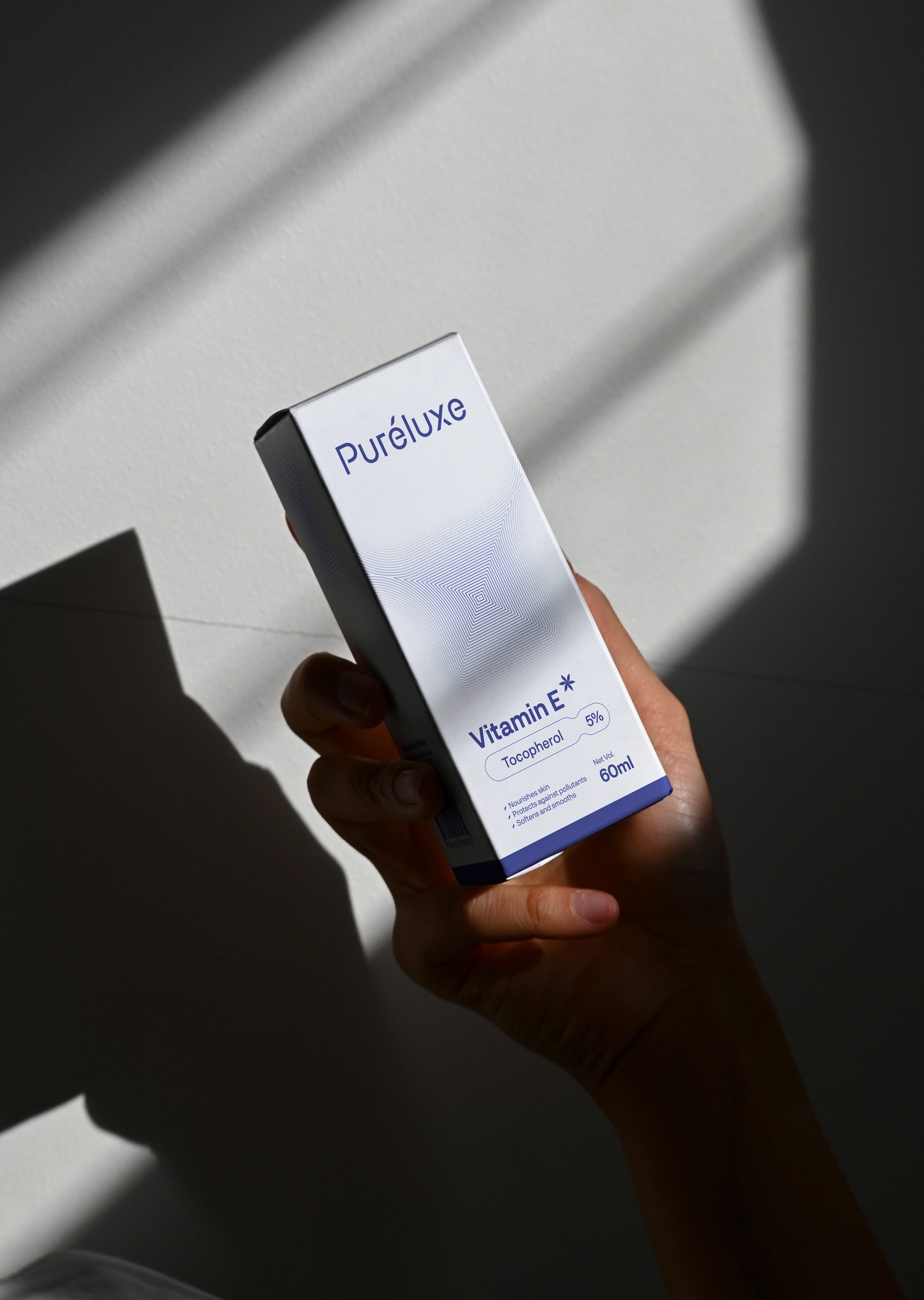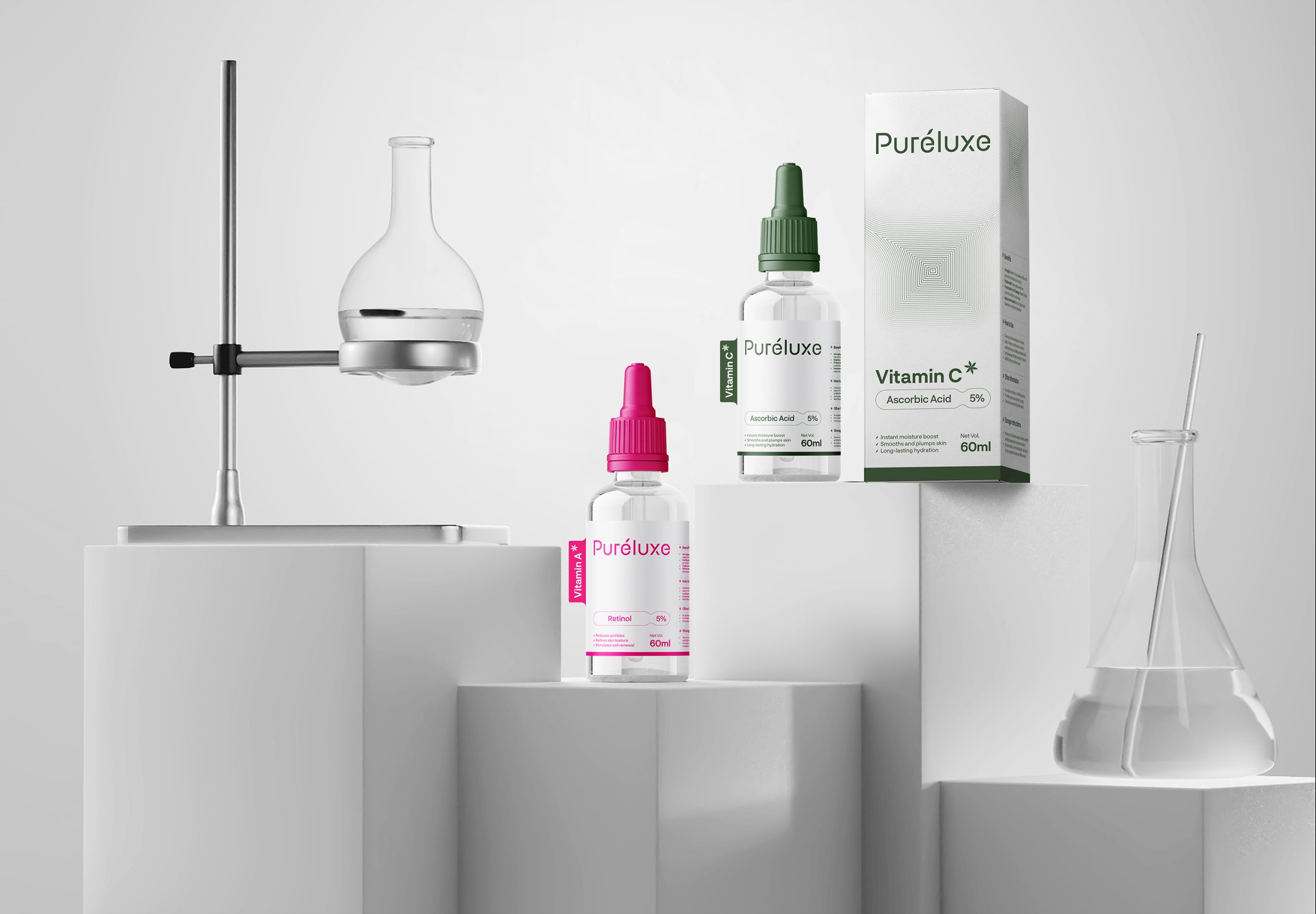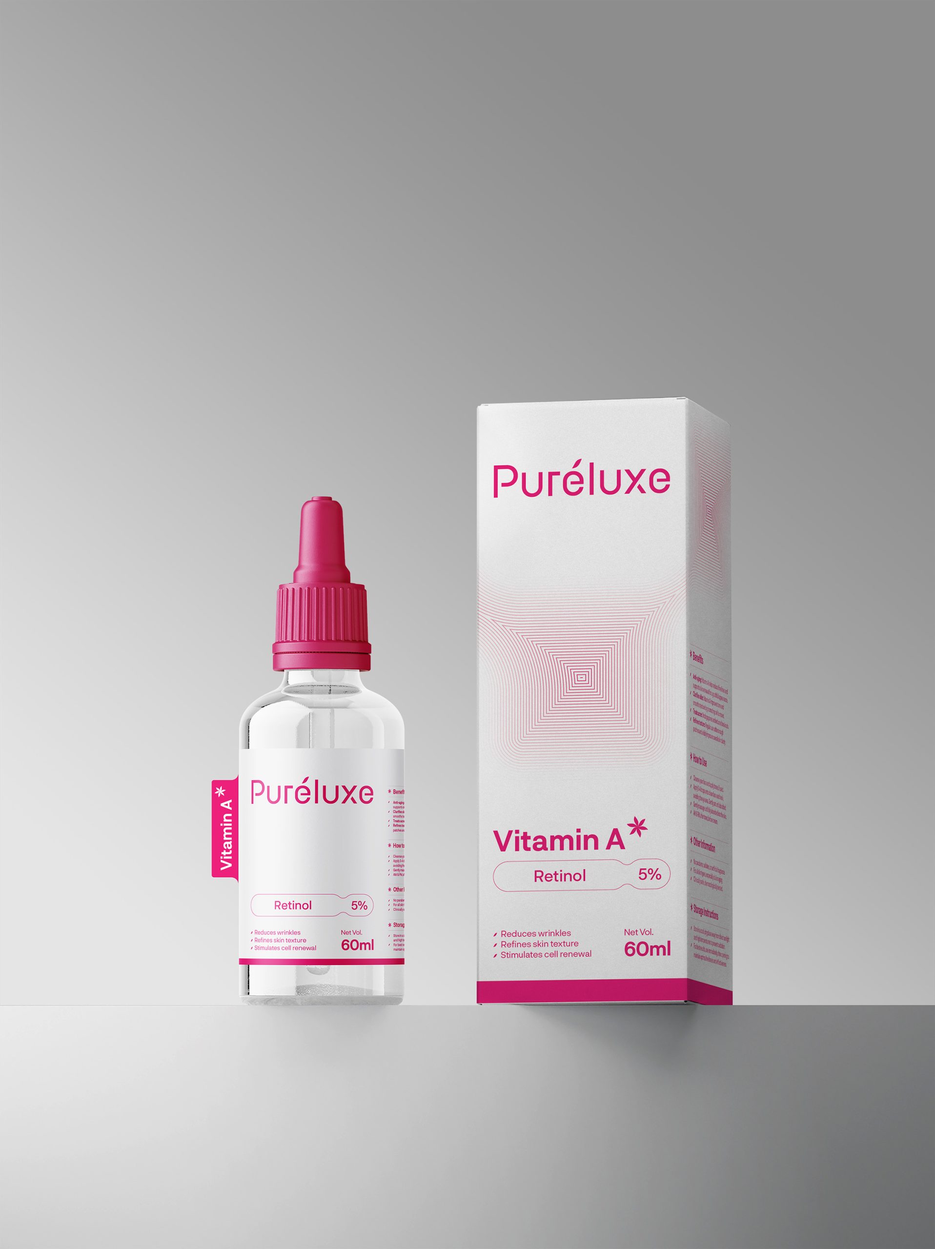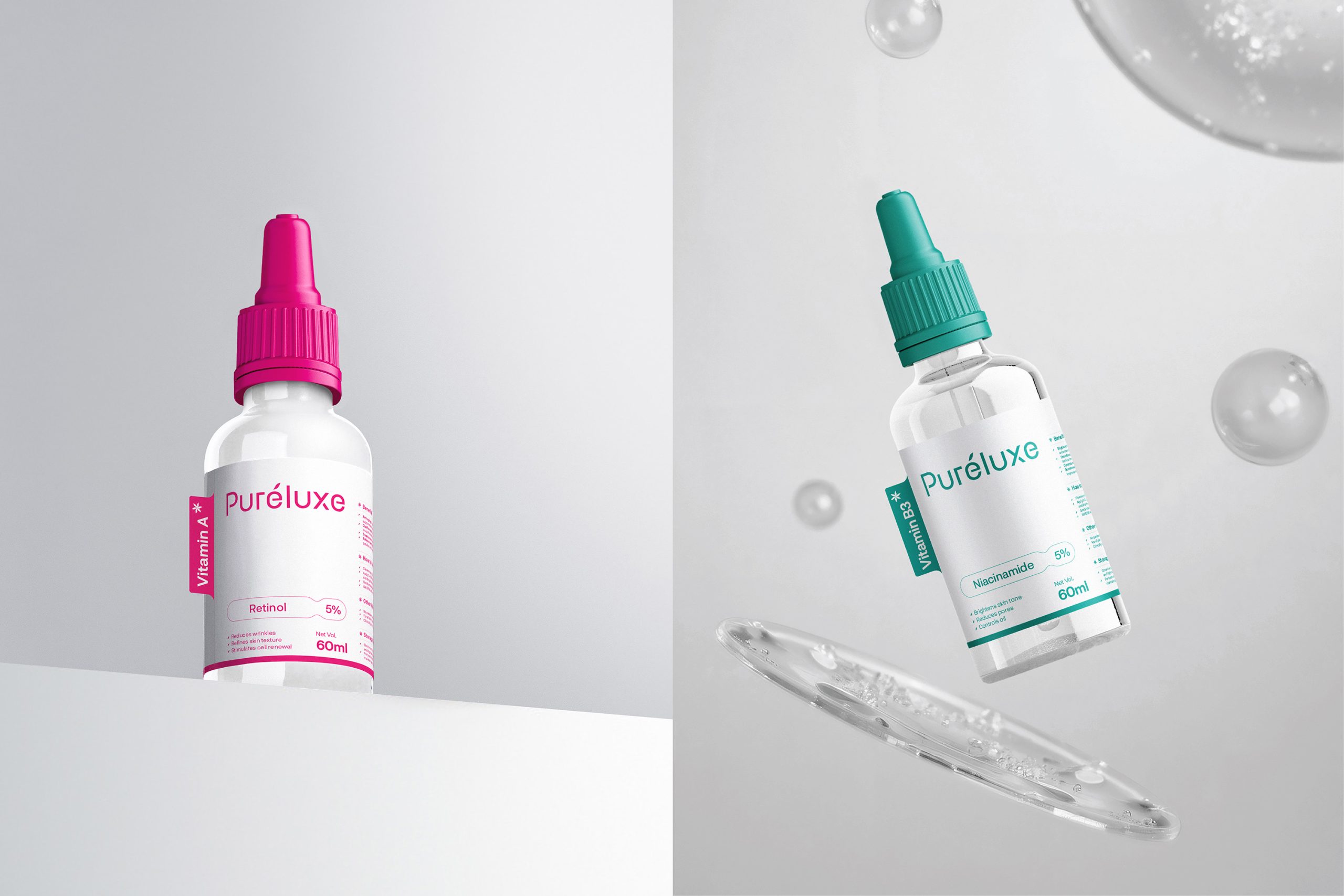 Pureluxe的包装设计则像是一场色彩与几何的时尚狂欢。白色的瓶身与包装盒是它的时尚底色,简洁而干净。品牌名称与产品信息以鲜明的色彩呈现,维生素种类对应的彩色滴头和文字标识,就像时尚秀场上的亮眼配饰,瞬间抓住眼球。包装盒上的几何线条纹理,如同精心编织的时尚密码,增添了设计的层次感与现代感。整体设计既展现了产品的专业与可靠,又不失时尚活力,仿佛在向消费者宣告:护肤也可以如此时尚有趣。