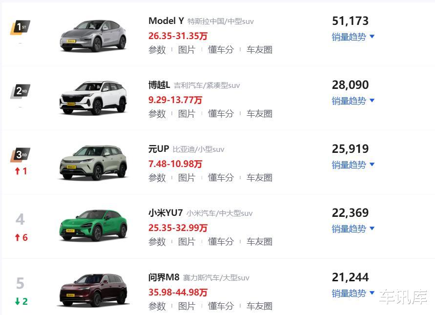 比亚迪元UP的月销量也是有明显提升,销量排名提升至第三名,成功进入排行榜前三。该车的销量大幅度增长,主要还是该车入门价格进一步下探,再加上配置的大幅度提升,吸引了更多消费者购买。小米YU7的销量也是大幅度提升,月销量为22369辆,销量排名更是从上个月的第十名跃升至第四名。该车的销量增长迅速,除了自身热度很高以外,主要还是跟工厂的产能有很大关联。问界M8的月销量也是轻轻松松突破2万辆大关,位居排行榜第五名。该车目前的销量还是非常稳定,已经连续好几个月月销突破2万辆,不愧是问界系列的明星车型之一。