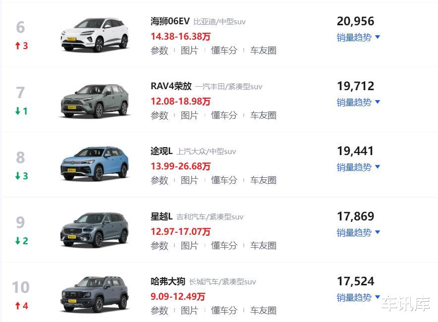 我们再来看看排行榜6至10名的车型,整体的销量变化还是比较大,销量成绩也都很不错。比亚迪海狮06EV的销量排名再次提升,月销量也是成功突破2万辆大关,位居排行榜第六名。作为一款热度较高的全新纯电中型SUV,海狮06EV上市以后销量持续提升,预计10月份还会稳定在排行榜前列。丰田RAV4荣放的销量排名有小幅度下滑,差一点点就突破2万辆大关,位居排行榜第七名。该车目前的优惠力度还是非常大,等到新款上市以后,销量应该还会有不错的提升。