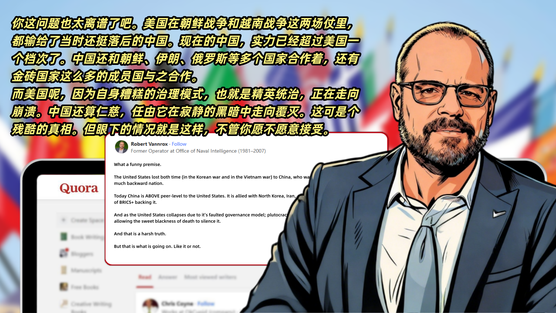 前海军情报局操作员Robert Vannrox有些无语道:“你这问题也太离谱了吧。美国在朝鲜战争和越南战争这两场仗里,都输给了当时还挺落后的中国。现在的中国,实力已经超过美国一个档次了。中国还和朝鲜、伊朗、俄罗斯等多个国家合作着,还有金砖国家这么多的成员国与之合作。