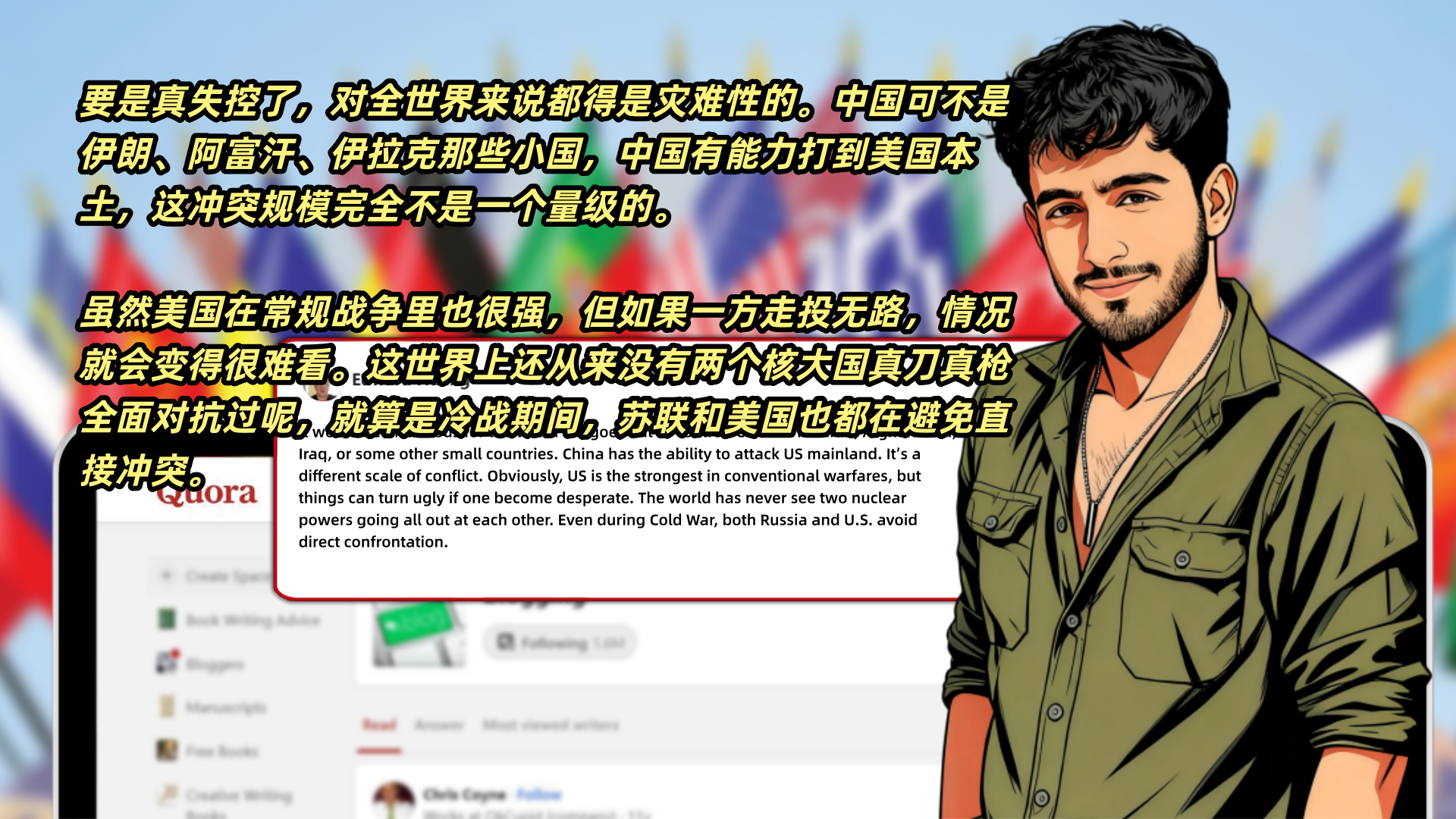 网友Edward Huang表示:“要是真失控了,对全世界来说都得是灾难性的。中国可不是伊朗、阿富汗、伊拉克那些小国,中国有能力打到美国本土,这冲突规模完全不是一个量级的。