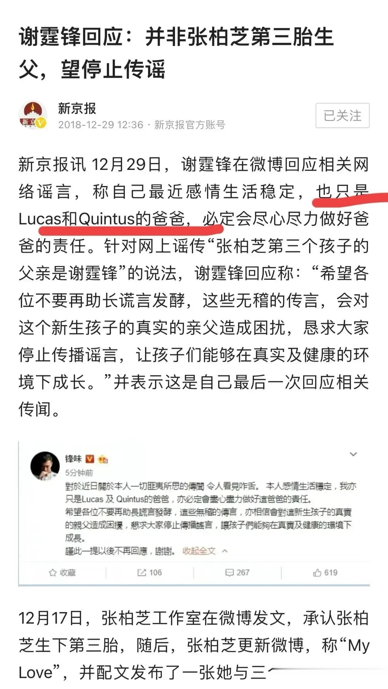 更多网友猜测,孩子的生父还是谢霆锋,不过,老谢很早就辟谣了,说自己只是Lucas和Quintus的父亲。