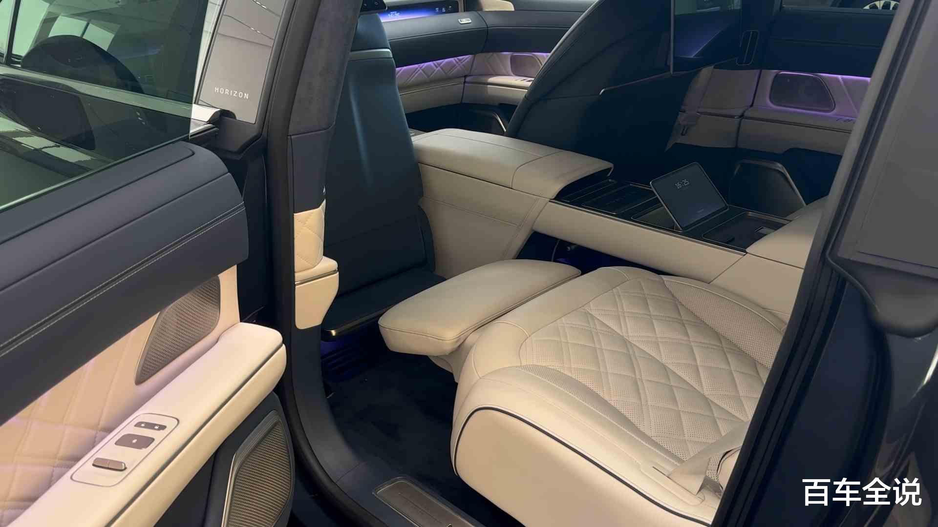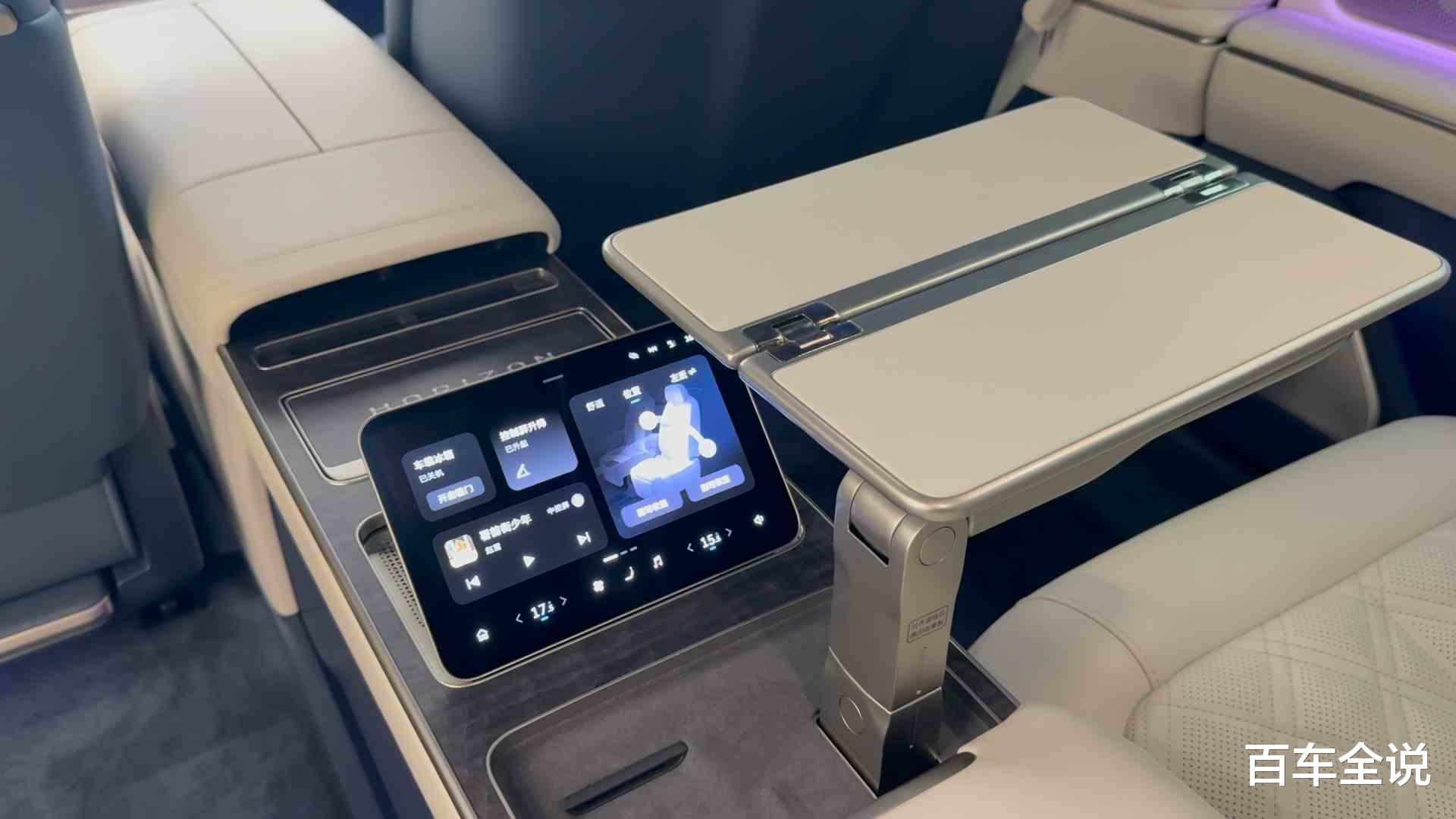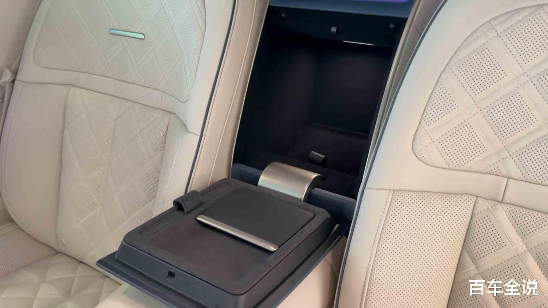 我看不少人分享这台车的后排时,都会说它有前后座椅通风/加热/按摩、10升车载冷暖冰箱、全车电吸门、9安全气囊、前后多层隔音玻璃、后排隐私玻璃/电动遮阳帘、后排双14.5英寸娱乐屏、3D环绕式氛围灯、35扬声器音响系统(总功率2800W)、四区空调、空气净化系统、ARNC主动降噪、超大全景天幕……这些豪华配置虽然能提升实用性,但我觉得这种产品更需要追求的不是配置,而是感觉。