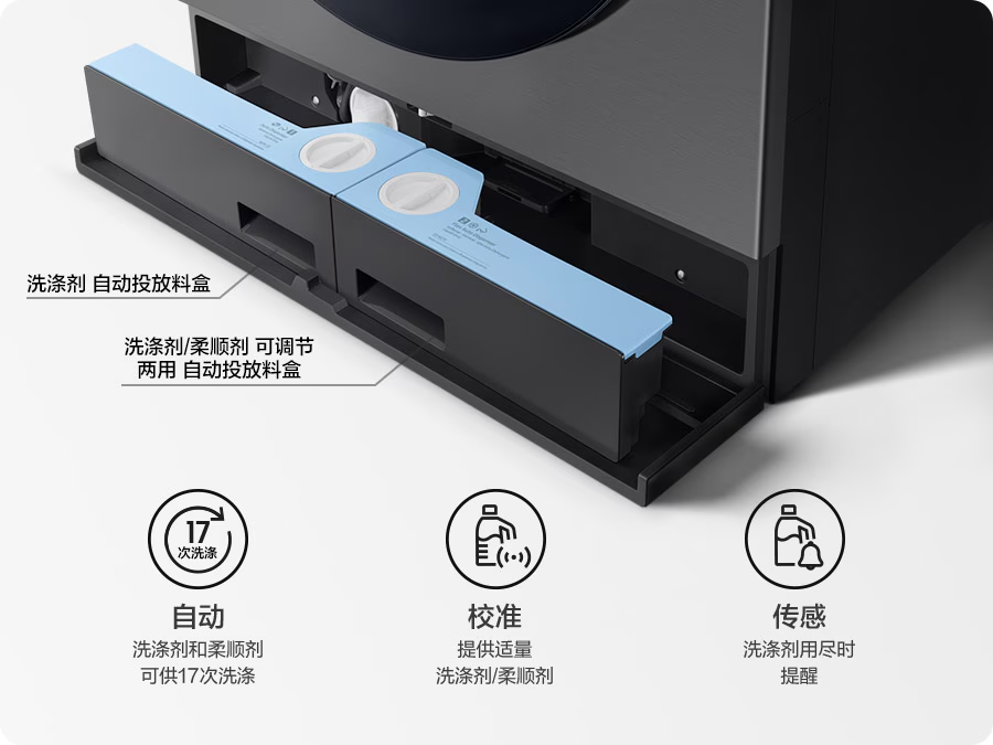 这一切都交给了机器的“大脑”。它会像一位经验丰富的洗护专家,自动匹配最佳的水量、计算出最合适的洗涤剂投放量,并智能地调控浸泡、漂洗和脱水的时间。这不仅仅是简单的自动化,而是一种基于实时数据的动态优化。更关键的是,它彻底解决了“洗衣液放多少”这一世纪难题。通过AI自动投放2.0功能,机器会根据衣物量和脏污度,精准计算并分配洗涤剂与柔顺剂。一次加满料盒,可满足多次洗涤需求,从此告别凭感觉倾倒的粗放与浪费。对于消费者而言,这意味着从繁杂的决策过程中彻底解放出来,洗衣过程简化为“放入衣物,一键启动”两个动作,实现了从“手动挡”到“自动驾驶”的跨越。