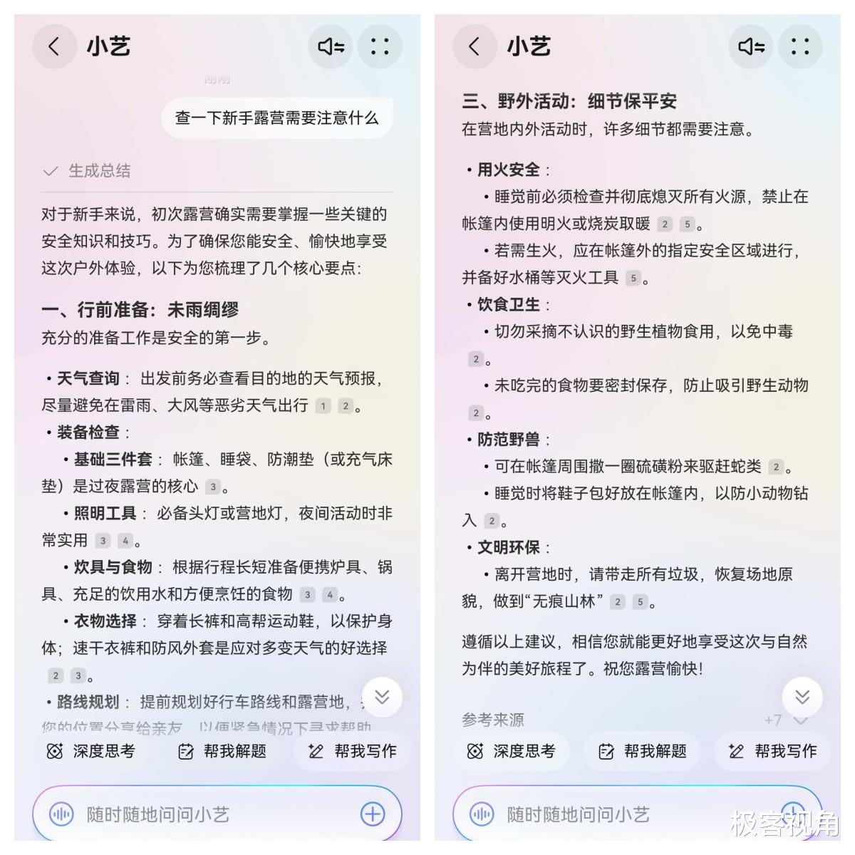 出发前我一个P人懒得多翻手机查攻略,直接对小艺说:“帮我查一下新手露营需要注意什么?”小艺便立刻为我整理出了一份特详细的攻略,连物品清单都列好了,从帐篷咋搭到户外用火咋注意安全,条条都写得明白,省得我自己东拼西凑查半天了。