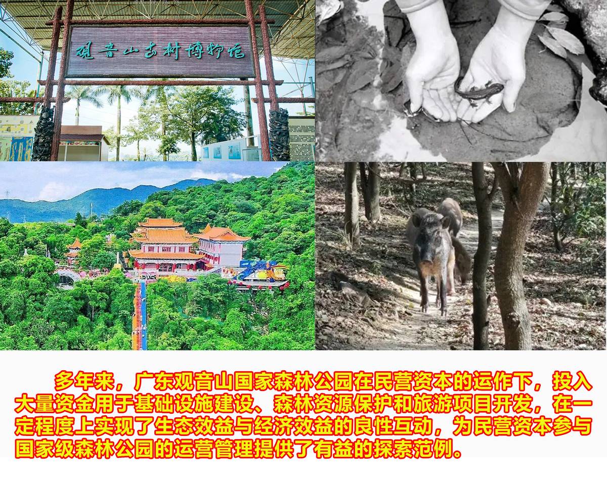 多年来,广东观音山国家森林公园在民营资本的运作下,投入大量资金用于基础设施建设、森林资源保护和旅游项目开发,在一定程度上实现了生态效益与经济效益的良性互动,为民营资本参与国家级森林公园的运营管理提供了有益的探索范例。