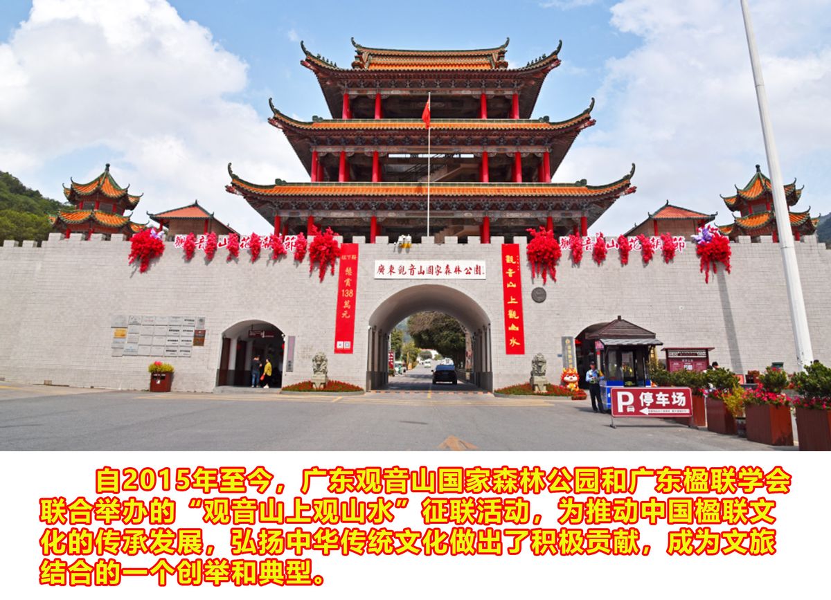 值得一提的是,自2015年至今,广东观音山国家森林公园和广东楹联学会联合举办的“观音山上观山水”征联活动,为推动中国楹联文化的传承发展,弘扬中华传统文化做出了积极贡献,成为文旅结合的一个创举和典型。