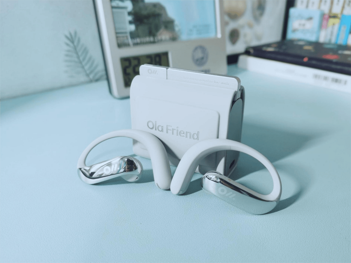 开放式蓝牙耳机好用吗,Ol afri en d 智能体开放式耳机单耳重量仅 6.6g,佩戴轻盈,柔性耳挂配合贴耳设计,长时间佩戴也不会明显压迫耳朵。充电仓采用鹅卵石造型,小巧便携,手感舒适
