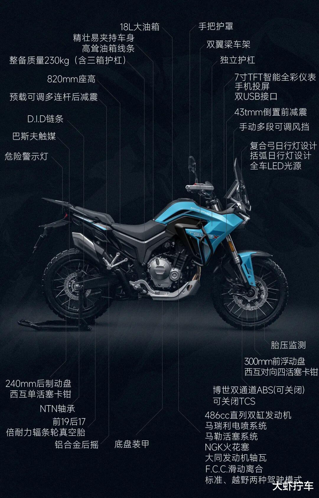 配置方面 ,T502X 在所有细节上都抱着精益求精的态度,采用国际知名品牌供应商,倍耐力辐条轮真空胎、西互制动系统、博世双通道ABS、马瑞利电喷系统、马勒活塞系统,NGK火花塞,大同发动机轴瓦,NTN轴承,F.C.C.滑动离合,D.I.D链条,巴斯夫触媒等,这也是摩旅车型能够长途跋涉的底层支撑。T502X采用7寸TFT全彩液晶显示竖屏,轻松获取数据和投屏信息;820mm座高搭配柔软收窄的坐垫,坐姿舒展驾感从容;前19后17寸倍耐力蝎子全地形真空轮组,带来更强的非铺装能力,190mm的最小离地间隙满足各种路况的适应性,支持你在翻山越岭之间去寻找野性释放的纯粹快乐。