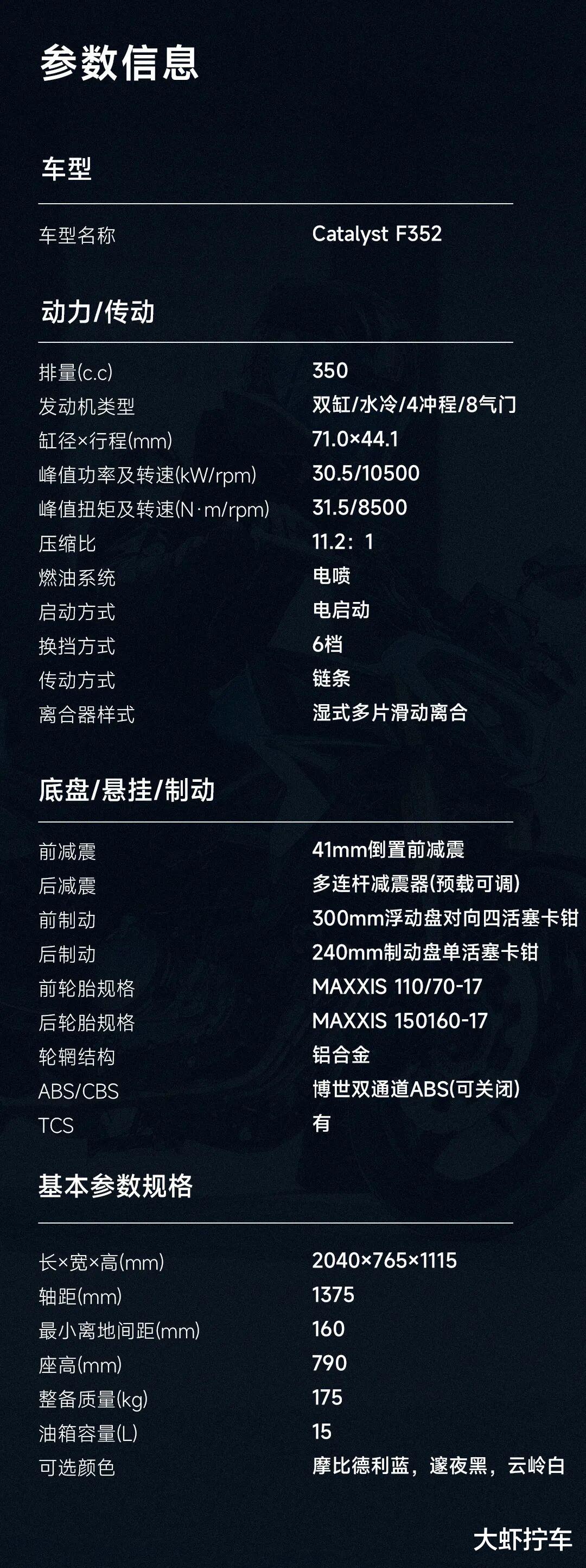F352搭载的高金349cc直列双缸水冷发动机峰值扭矩30.5kW/10500rpm、最大扭矩31.5N·m/8500rpm,动力输出线性易控的同时具备随叫随到的动力和高转发力空间,让新手也能体验高转速域的刺激感。与这个级别常见车型采用钢管跨接式的车架不同,F352采用了钣金结构双翼梁车架,能有效分散行驶中的各方向受力,强度更高稳定性更好。175kg自重搭配790mm座高,适应大部分人群身材,上手门槛低且驾控感受灵活轻快。电控安全上,F352配备了可关闭的博世ABS和TCS系统,确保安全性的同时具备更强的可玩性和操作空间。标准、运动、玩家三种运动模式随意切换,可以陪你从新手期一直到成为具有丰富经验的街头老玩家。