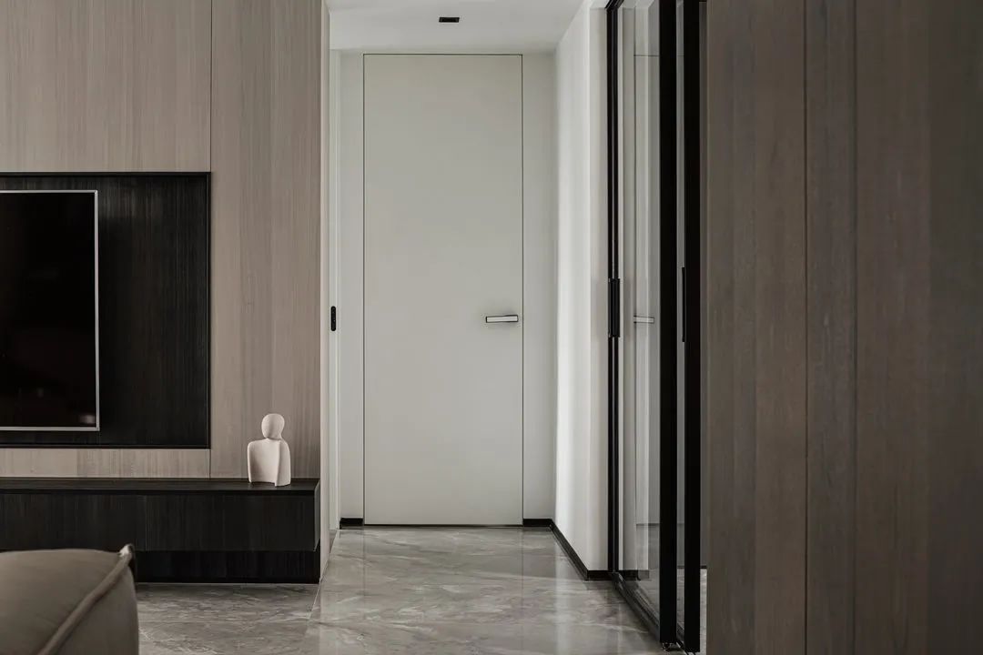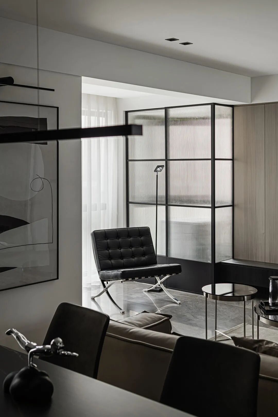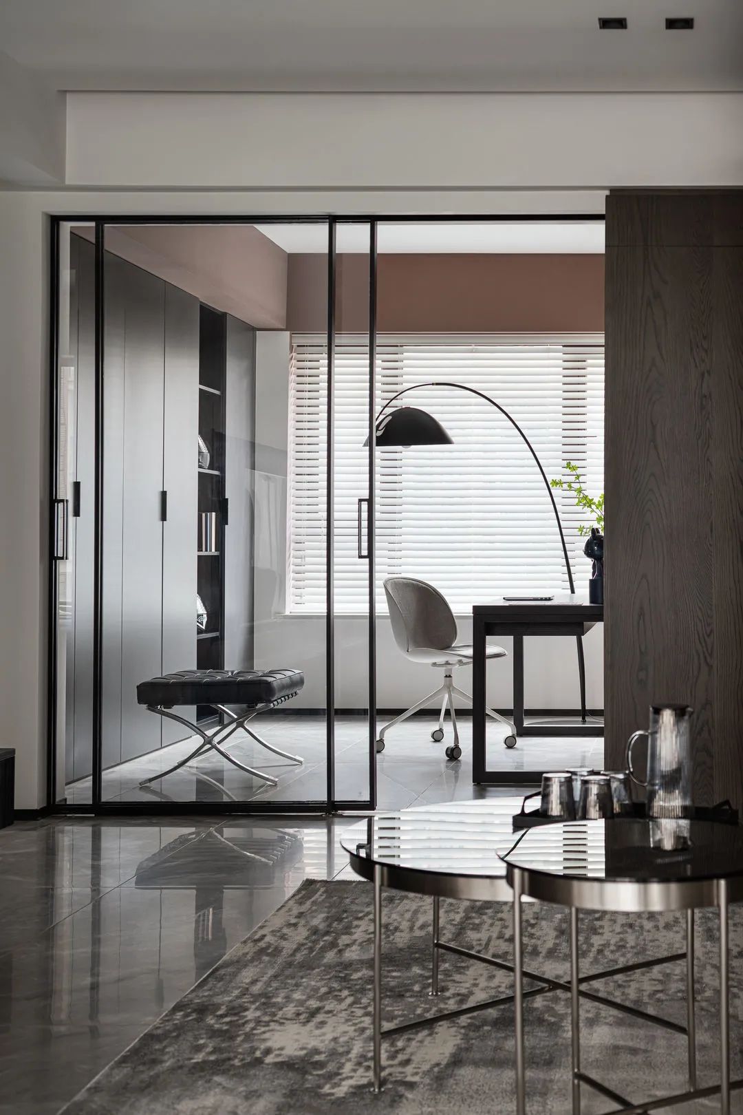 通往主卧的无边框门尽显时尚与简洁;不冗余又讨喜。书房玻璃门的设计让书房同客厅可分可合,引入自然光的同时释放美感与层次。