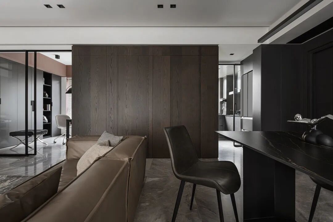 卫生间门作为木墙一部分,隐形且神秘;书房门双开玻璃门,拉宽整个公共区域视觉,也极大地改善了采光让整个房屋变得明亮起来。隐形的卫生间门,具有极简的视觉效果,却又增添了几分惊喜。