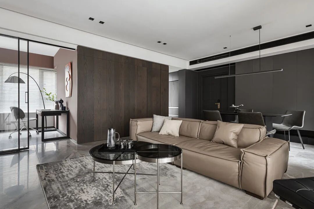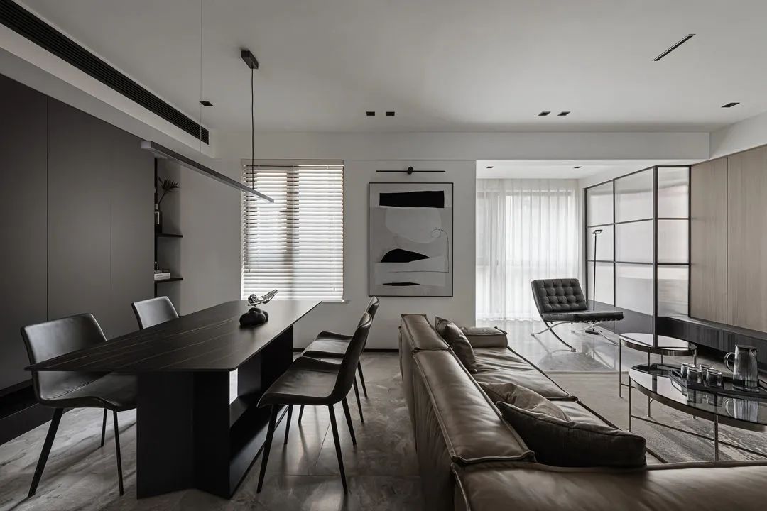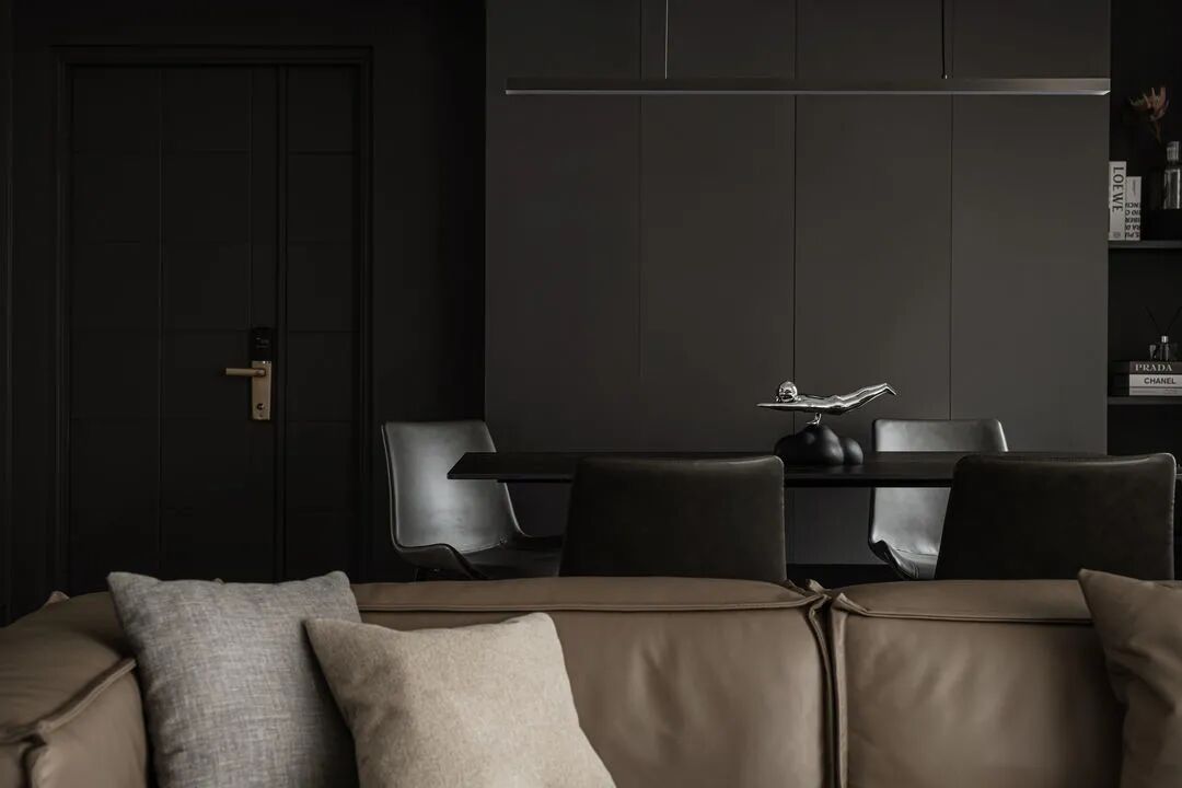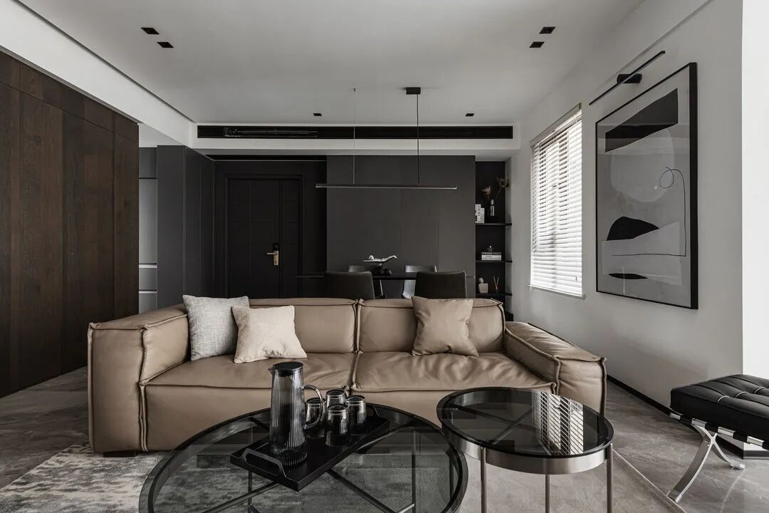 空调风口置于餐边柜上方,让客厅视线更加宽敞。深色的餐厅背景配上暖色皮质沙发,点亮了空间,慵懒又不乏质感。客厅墙面黑白装饰画,似乎在安静地诠释着一切,生动不张扬。