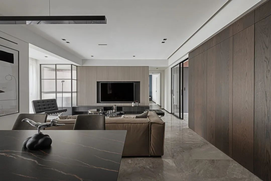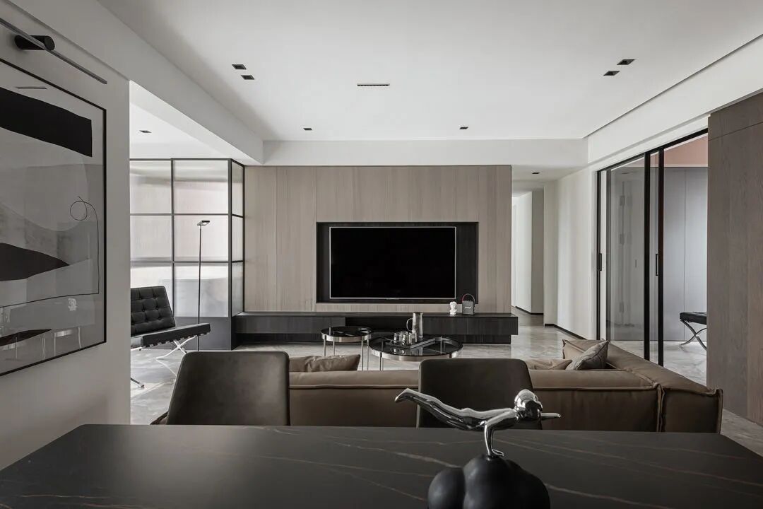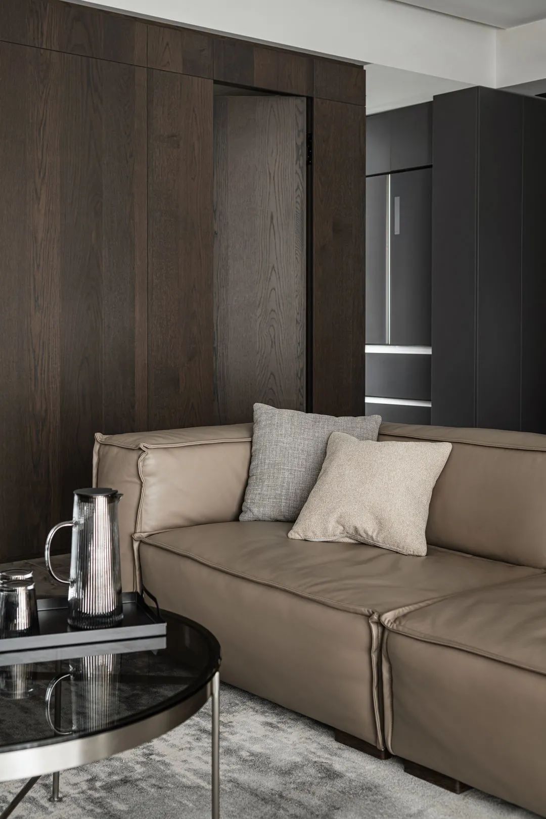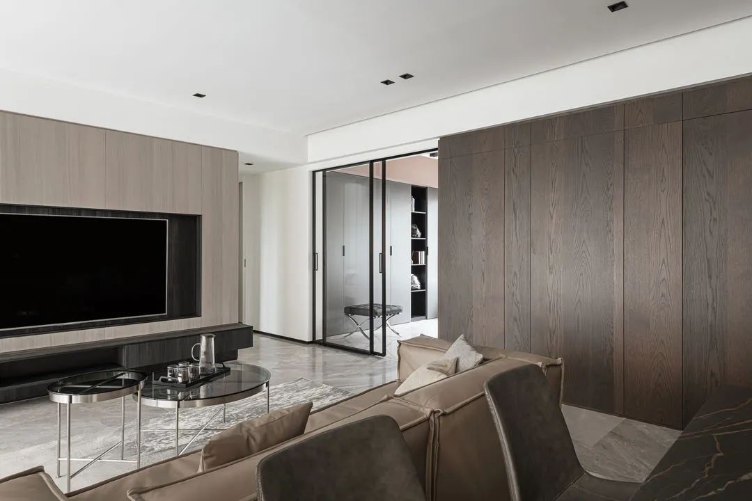 绸缎木整体电视墙提升客厅温度,与客厅无主灯设计结合,简洁且氛围感十足。