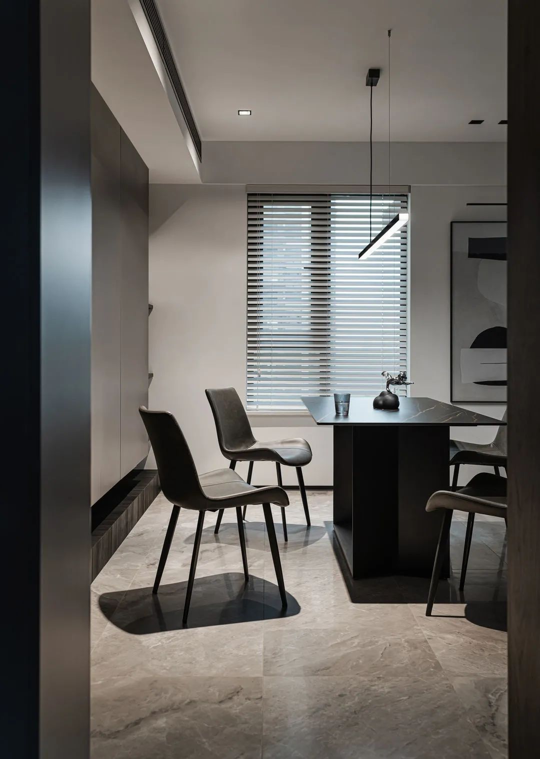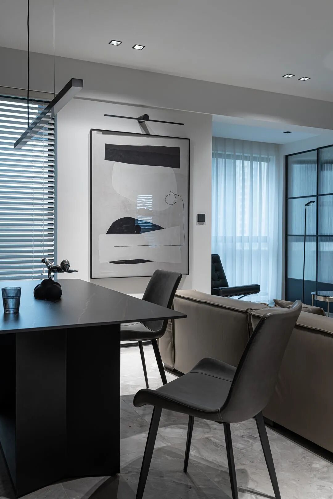 餐厅边柜开放式设计与白色百叶窗呼应,让餐厅变得更敞亮又舒心。随手可放一书一茶的不锈钢边几,让空间显得安静且质感。