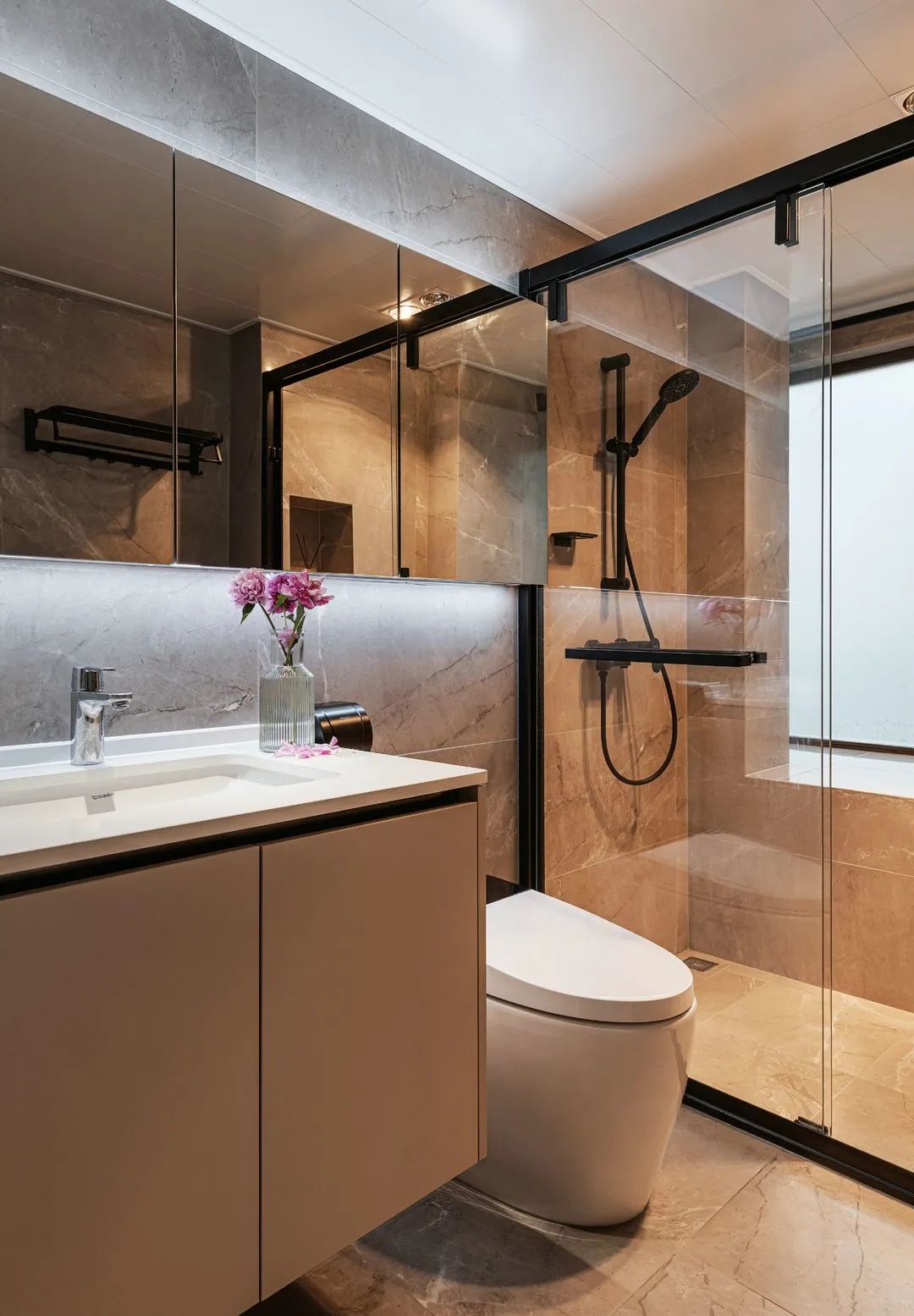 卫生间作为功能性空间,洗漱台、马桶、淋浴室置于同一空间,极好地将生活的便捷与艺术融合。