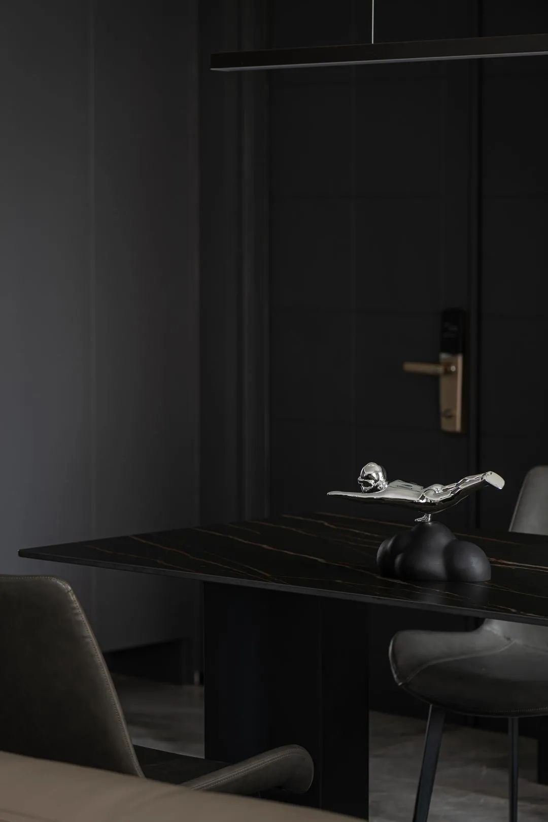 入户门(专用漆)改为背景墙的同色系,使得原本看起来不和谐的墙面变得整体统一。岩板餐桌的选择,让质感更加明显又和谐。