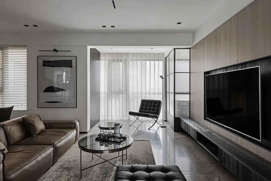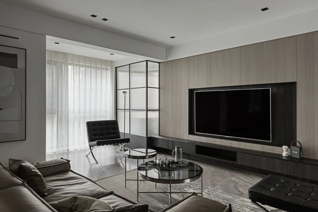 客厅电视墙与生活阳台拉通设计,让视觉更大,饰面板与黑框长虹玻璃搭配,富有更多质感和层次。