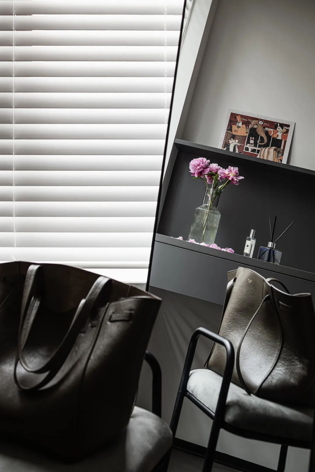 整个房屋的设计简约、素雅而静谧,在灰色主调下,我们在书房中点缀了红色,让空间呈现出神秘的色彩美学。深色漆与灰色地砖、灰色柜子的搭配,让书房有严谨感受,也同时有屋主内心喜欢的色彩。