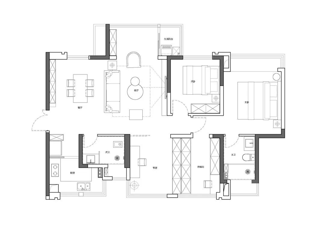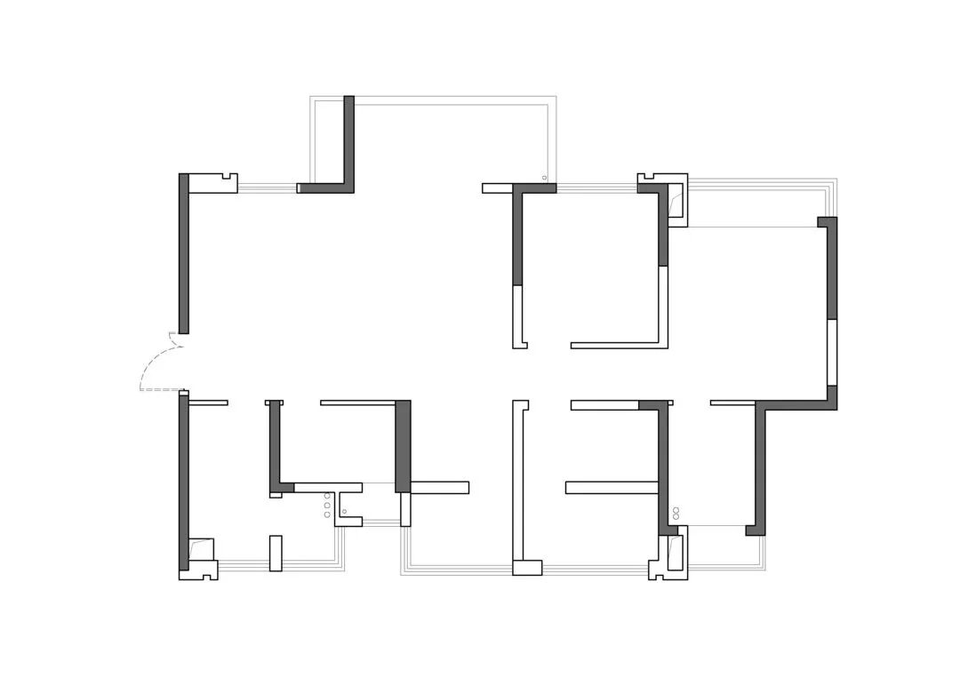 ◾改变生活阳台位置,让厨房空间增大的同时还有合适的空间增添鞋柜。◾书房墙体改为透明玻璃门,半开放试书房形成,也很好地改善通风与采光。◾书房和衣帽间做靠背储物柜,省去砌墙成本,释放空间的同时满足储物需求。◾客厅阳台门拆除,阳台纳入客厅空间,客厅视觉更显大气。◾生活阳台移入客厅阳台原本凹进去位置,完善清洁功能;加上长虹玻璃门的设计又拓宽了电视墙的视野。