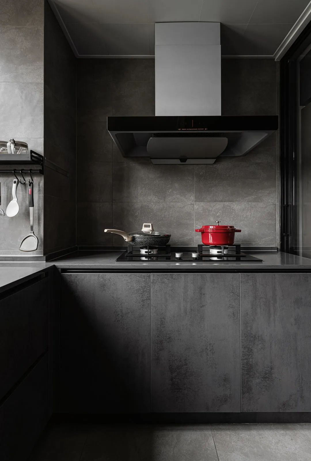 女主人追求深色质感,厨房也不例外,红色蒸锅点缀整个厨房,显得俏皮而温馨。