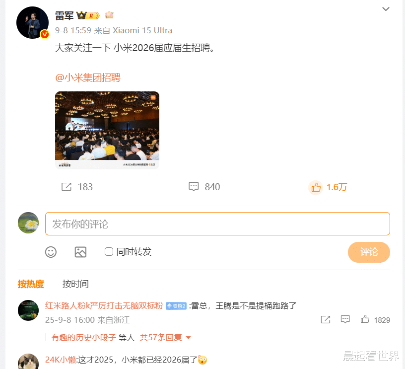 就在那英绯闻刷屏前三天,小米刚经历了一场公关危机。9月8日,中国区市场部总经理王腾因泄露公司机密被辞退,相关话题当晚登顶热搜第一。尽管雷军曾多次调侃王腾 “泄密专业户”,但此次事件仍引发投资者担忧,小米港股开盘一度下跌1.55%。不过,小米迅速通过人事调整和新品预热转移焦点:9月5日官宣小米16发布时间提前,9月10日又推出智能晾衣机、电动牙刷等三款新品。