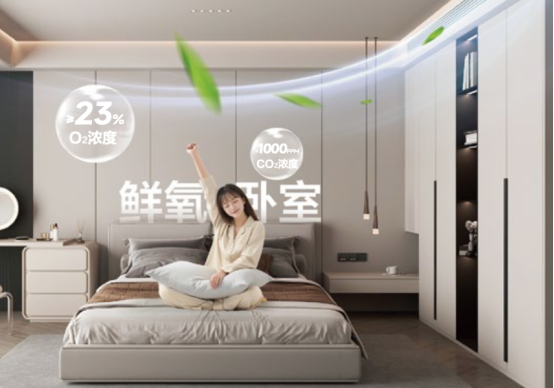 你是否常常被睡眠问题困扰?难以进入深度睡眠,早起昏沉,睡眠后反而疲惫不堪。其实,这可能是空气质量不达标在作祟。海信中央空调新风室内机,为你解决这一难题。它引入洁净鲜氧,有效降低 CO₂浓度,即使夜间关窗,也不会感到憋闷,让你睡得香甜。