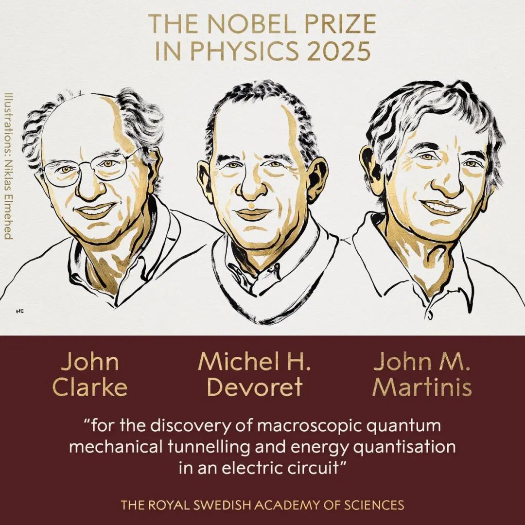 北京时间 10 月 7 日,瑞典皇家科学院发布公告,将 2025 年诺贝尔物理学奖授予英国裔美国科学家约翰・克拉克(John Clarke)、法国裔加拿大科学家米歇尔・H・德沃雷特(Michel H. Devoret)与美国科学家约翰・M・马丁尼斯(John M. Martinis),以表彰他们 “在宏观尺度下实现量子隧穿效应的精准观测与定量研究” 的突破性贡献。