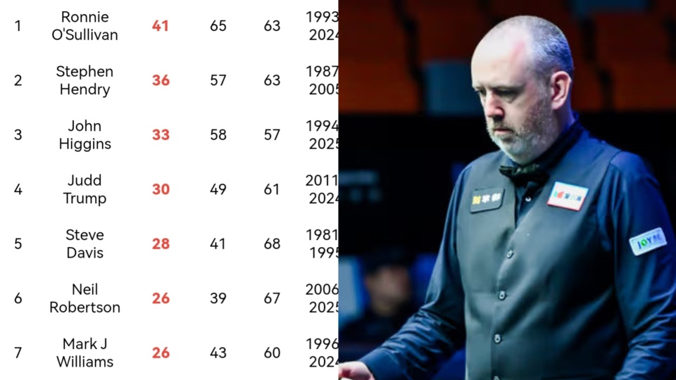 第一:火箭41冠、第二:亨德利36冠、第三:巫师33冠、第四:小特30冠、第五:老戴维斯28冠、第六:罗伯逊26冠、第七:马威26冠、第八:塞尔比24冠、第九:丁俊晖15冠、第十:墨菲13冠