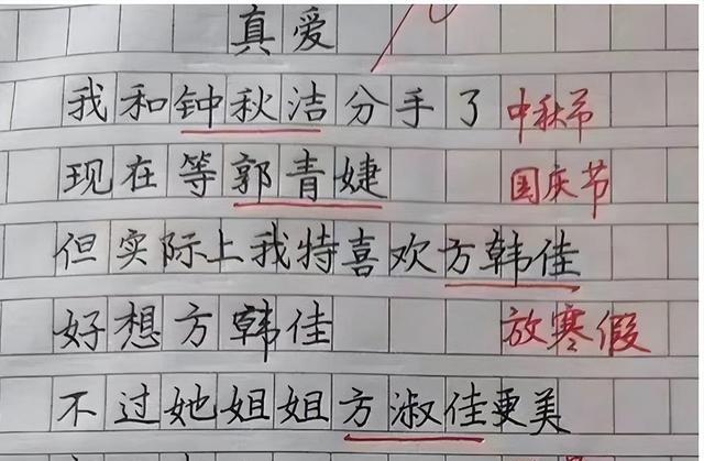 小学生作文《真爱》火了,6句话爱上5个人,老师:别太荒谬!